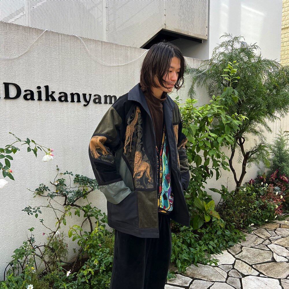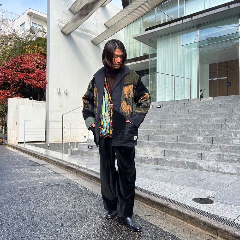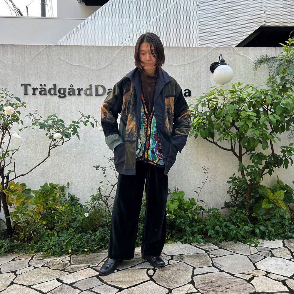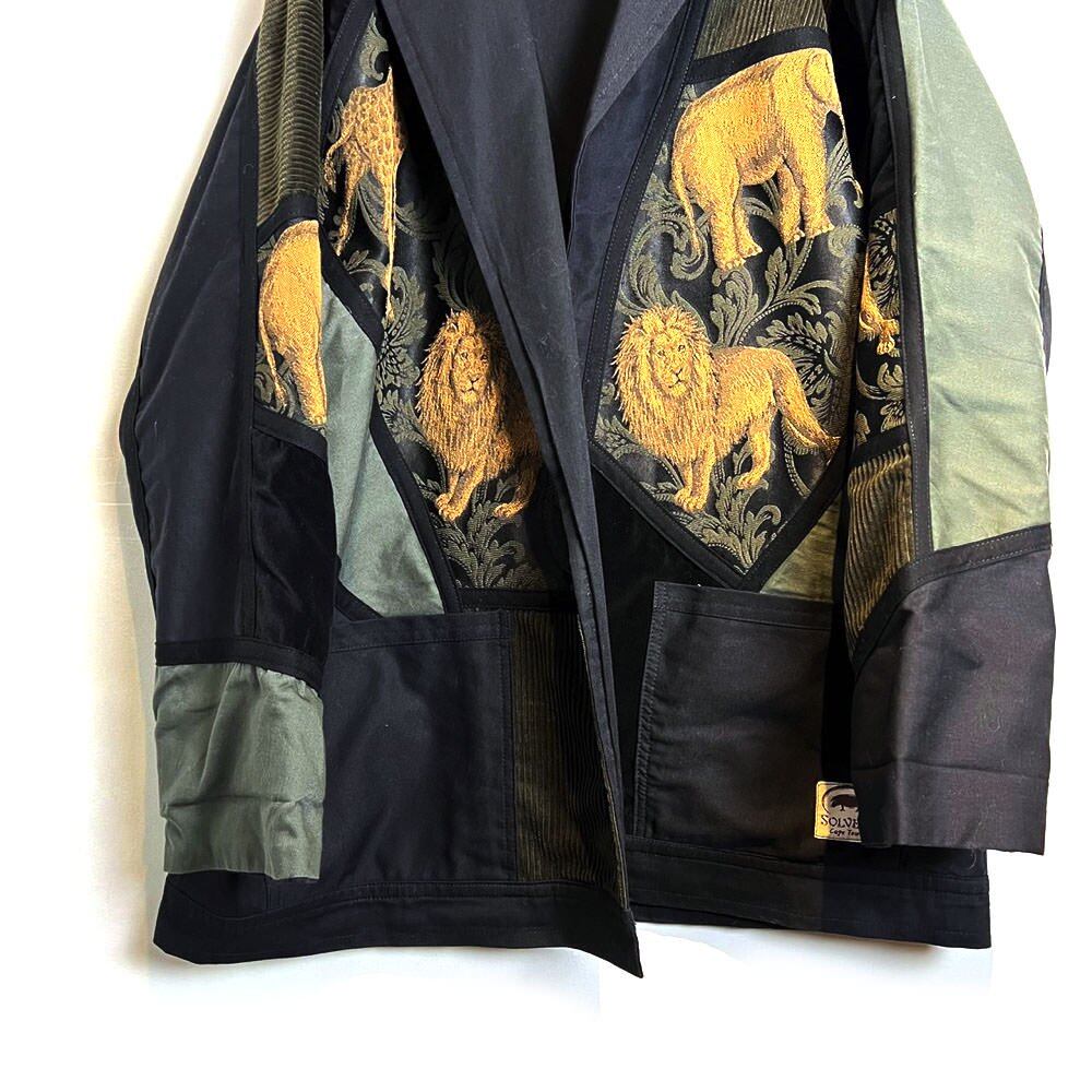 Cotton jacket from the 80s Asymmetrical and random material switching such as corduroy, velvet, and gobelins Its an interesting piece. nice silhouette
