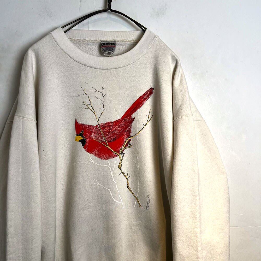 90s sweatshirt A red bird printed on a milky white color with a soft impression. Relaxed silhouette, vintage sweatshirt with a very good size