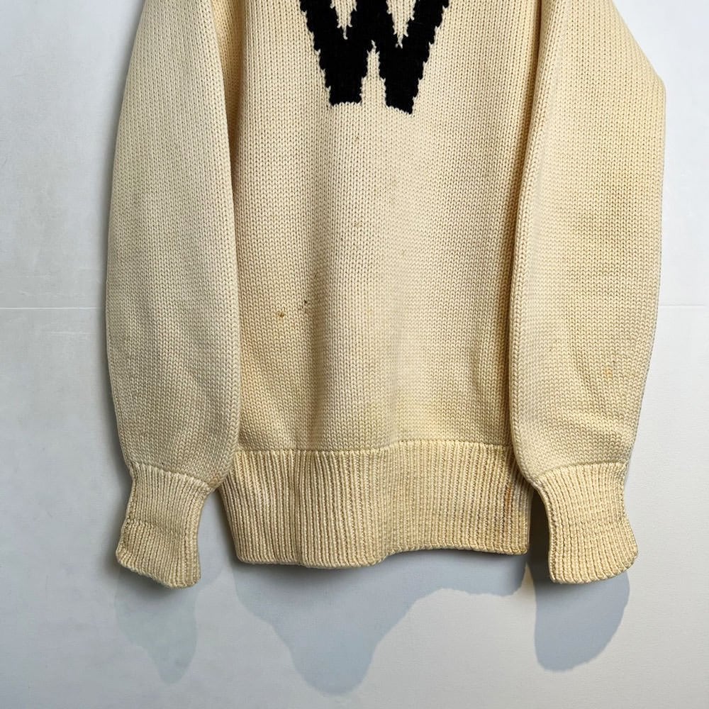 A lettered sweater from the 50s A tasteful off-white color with a large W letter gives it a nice atmosphere 100% wool knit with a solid texture that seems to be a vintage lettered knit Just the right size, a vintage sweater that looks great with an inner layer