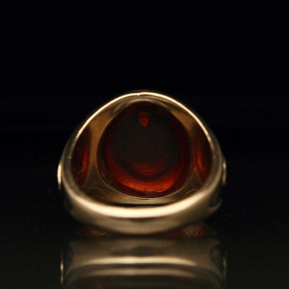 Vintage class ring from 1968. Until this age, the rare top stone is a round type that makes a statement, and the large appearance like a military ring gives it a dignified look. The top seems to be a synthetic ruby, but the dull red color gives it an elegant atmosphere. It has a heavy construction and fine engraving, and the side design in particular has a solid feel. ONEIL CO 10kt gold stamp. Please check the condition in the photo and understand the characteristics of vintage before purchasing.