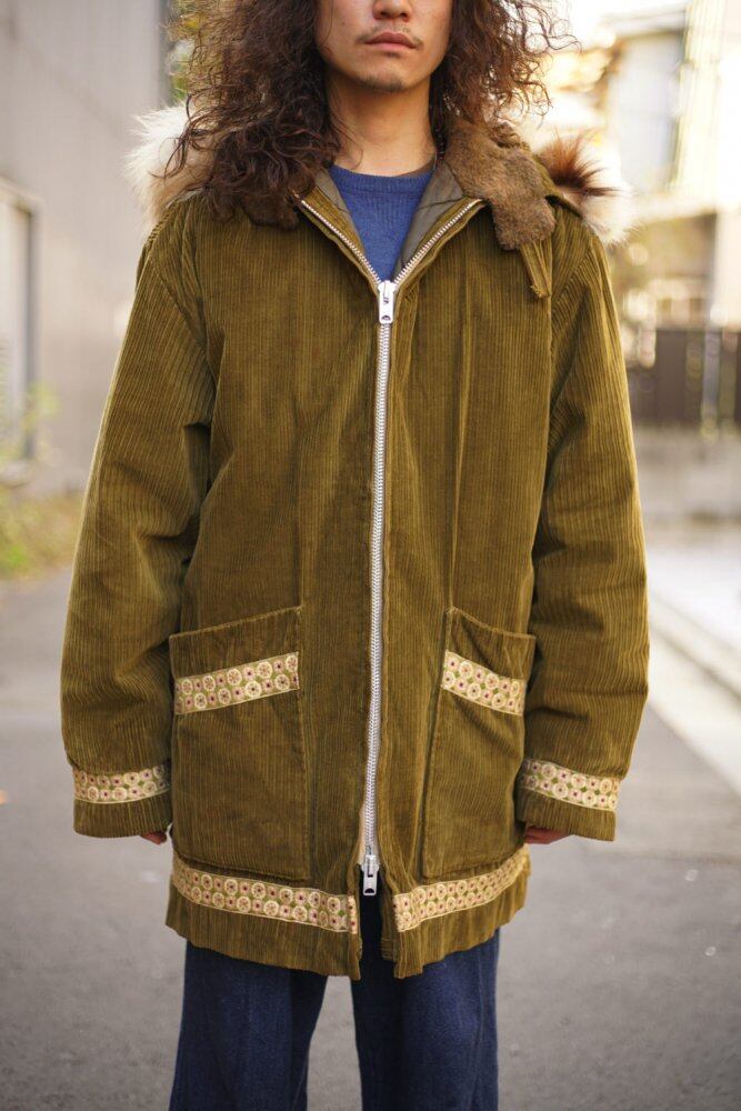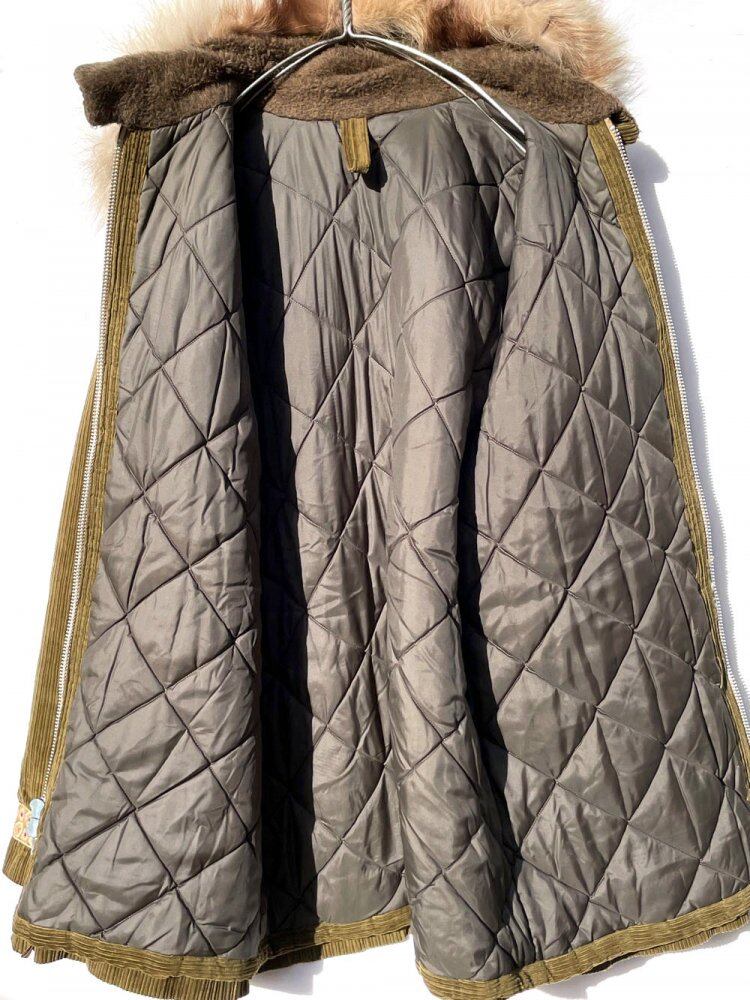The hood is made of long pile real fur, probably coyote, and has a characteristic design with Tyrolean tape in various places.