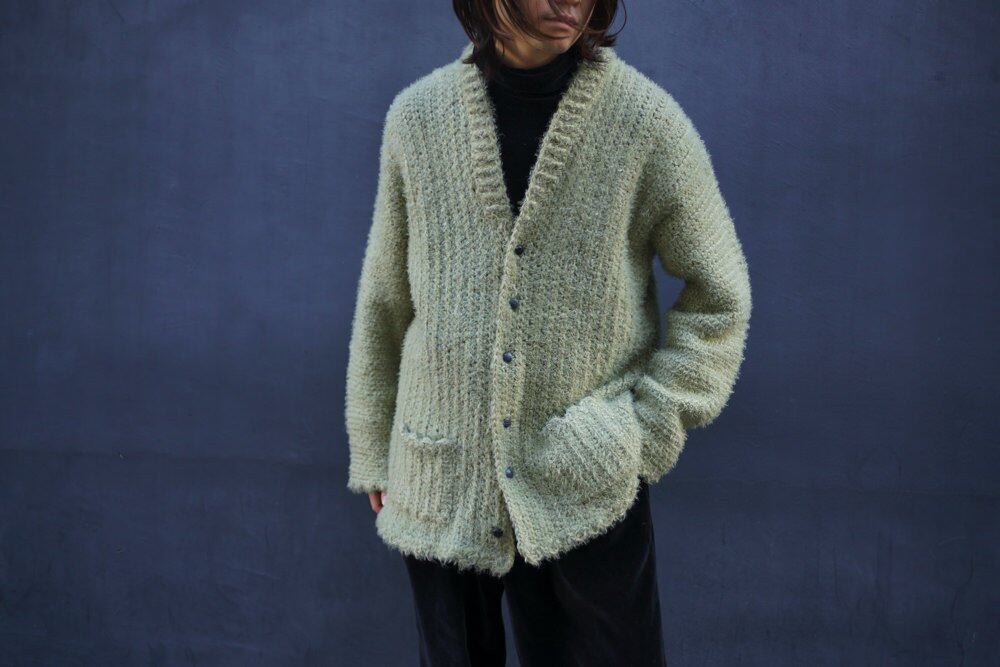 The hand-knit low-gauge rough knitting gives it a gentle look, and the grayish olive color also accentuates its elegance.