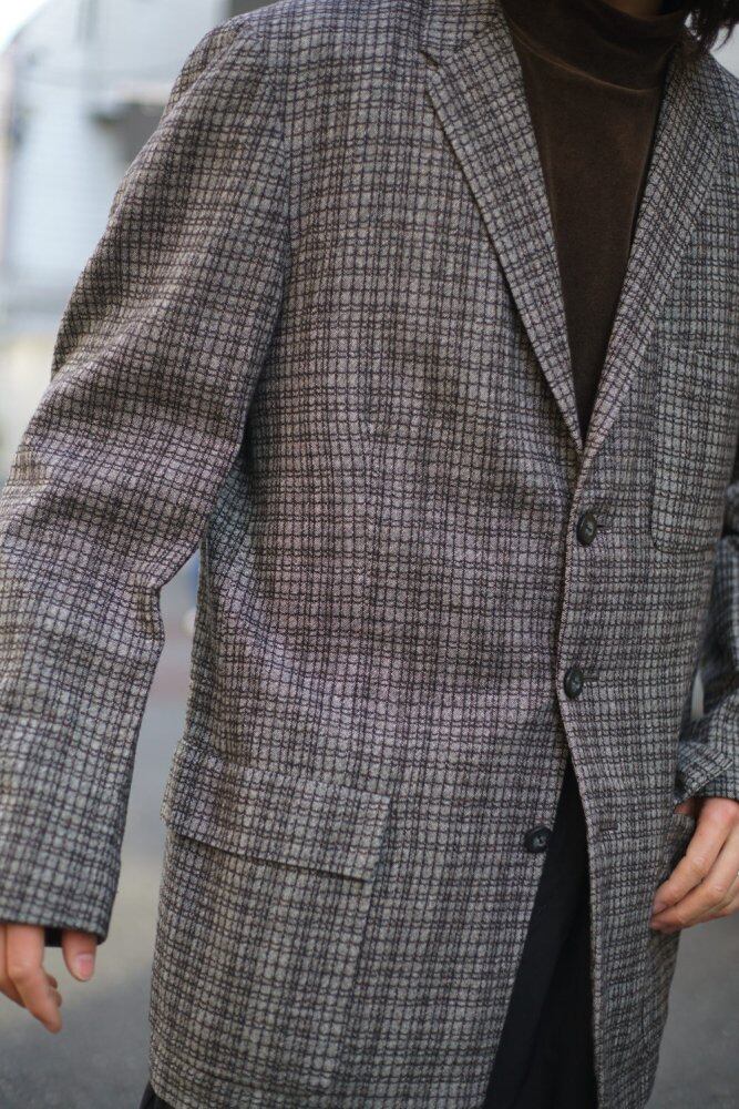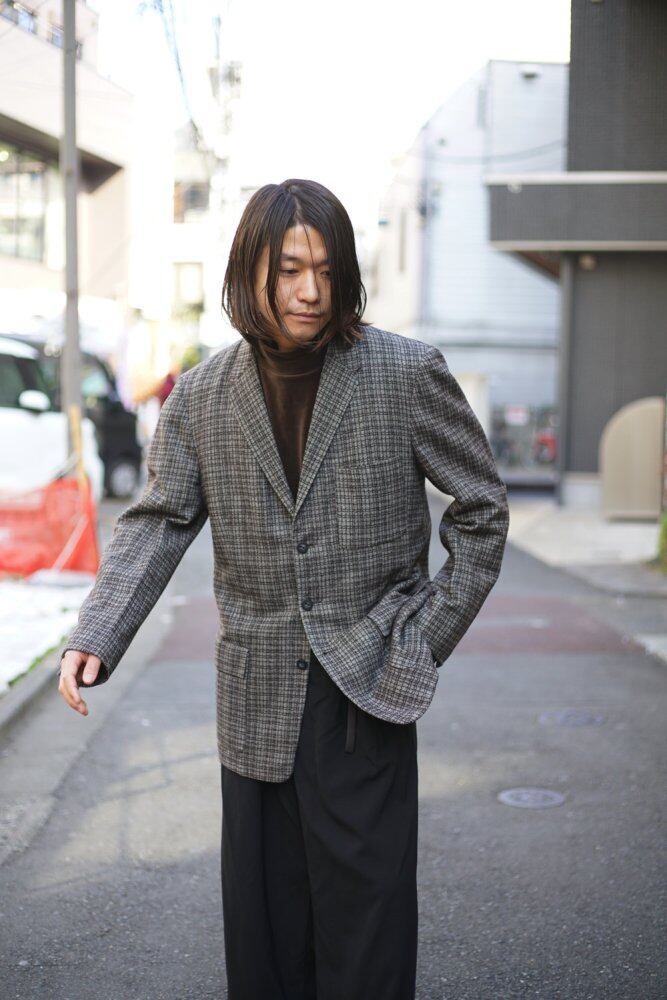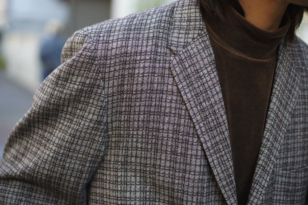 The 60s-like narrow V zone gives a vintage feel, and the dull and elegant coloring and soft texture make it comfortable to wear.<BR> The mannishness of the box silhouette of the time remains, but the softness of the fabric creates a soft line that follows the body, and the shoulder pads are intentionally removed to create a relaxed silhouette.