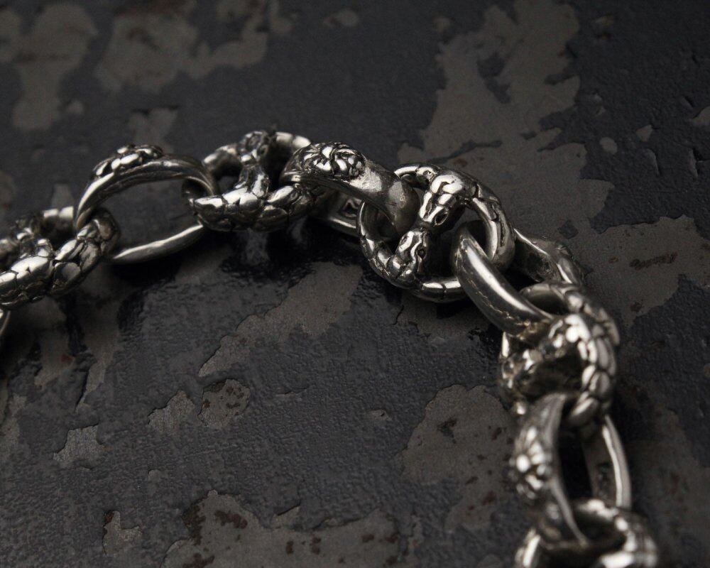 I dont know the artist, but this is an American chain bracelet from the 1990s. Carefully crafted and handcrafted with no seams. It is an elegant individual with a sense of size that makes it look neat even though it has a solid feeling. The design of the snake, which also leads to Memento Mori, is a design that coexists with mysteriousness and mannishness. 925 stamp. Since it is an old item, there are scratches, etc. Please check the photos and understand the characteristics of vintage before purchasing.