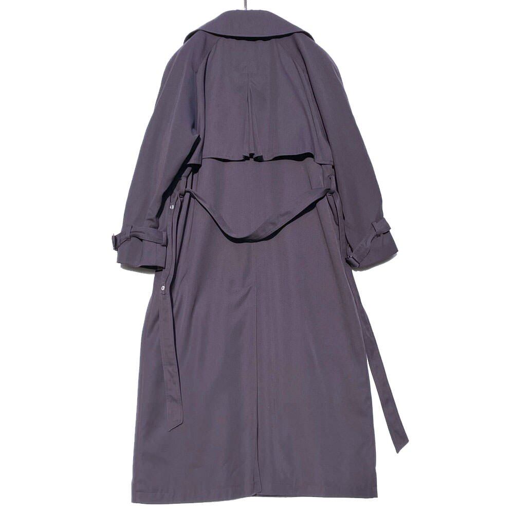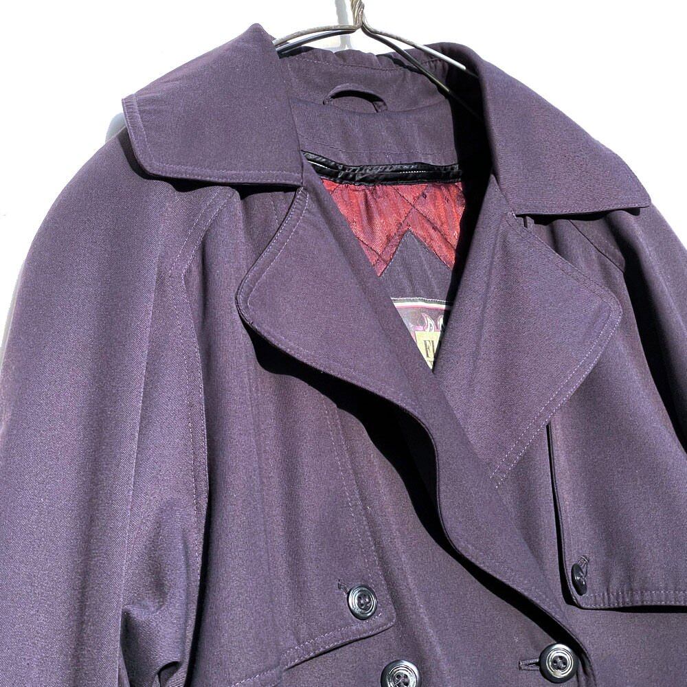 Around the 1980s, the FLEET STREET vintage trench coat used moderately thick rayon/polyester fabric with a unique thick and smooth texture, and the vintage-like dull purple color body looks sexy with a dull luster.
