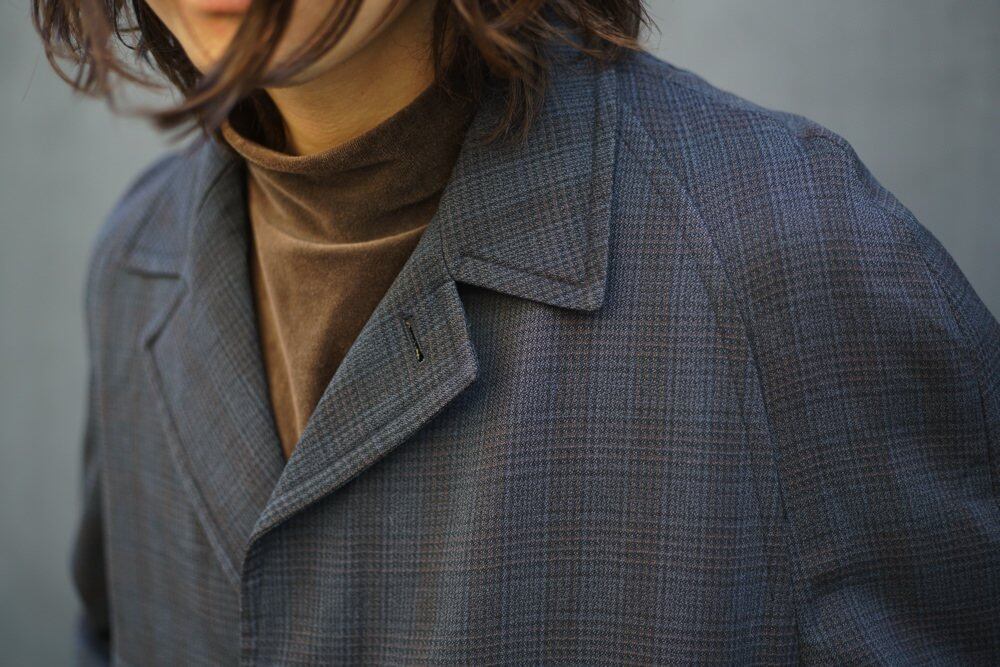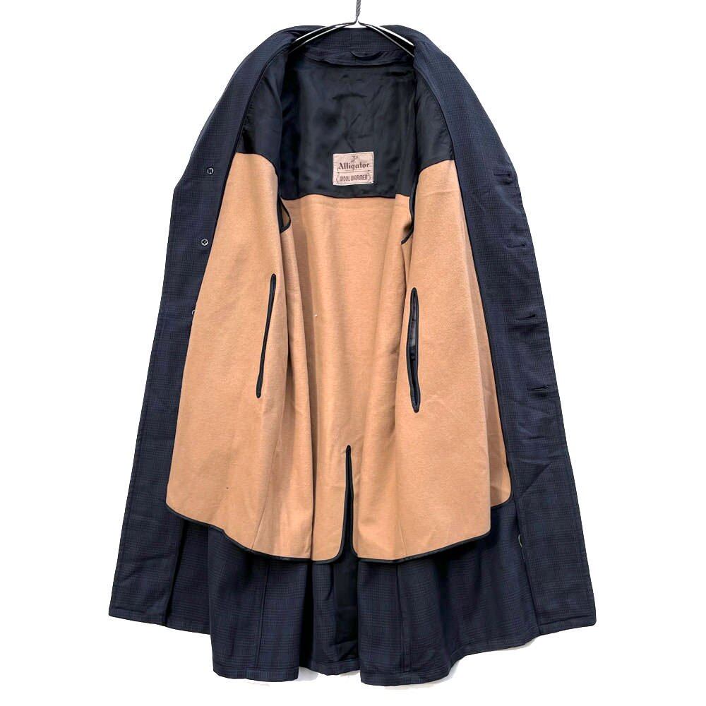 Around the 1960s, this is an Alligater vintage stainless collar coat. An elegant fabric with a faint bluish charcoal gray and glen check is used, giving it an attractive look with a dull sheen.
