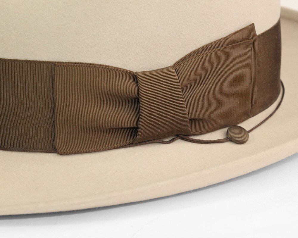 [MALLORY] fedora hat from the early 1950s. Americas oldest Fedora maker, which has been making hats since the early 19th century, grew to be called Americas second, but it was purchased by STETSON in the 50s and disappeared in the late 60s. Hatter has a high rarity value even in the vintage market with many excellent quality and design. This is a high-end line sold for $15. The high-quality beaver felt has a soft yet firm texture. Diamond silhouette 6cm cabana edge (with felted brim end) brim for a mannish look that is typical of this era, with a trolley string (for wind protection that fastens to the buttonhole). The contrast between the light tan color and the brown ribbon is a beautiful gem. It is in very good condition considering its age. Comes with a box, stylish design with atmosphere. Since it is an old one, there is rare deterioration over time. Please understand the characteristics of vintage items in advance.