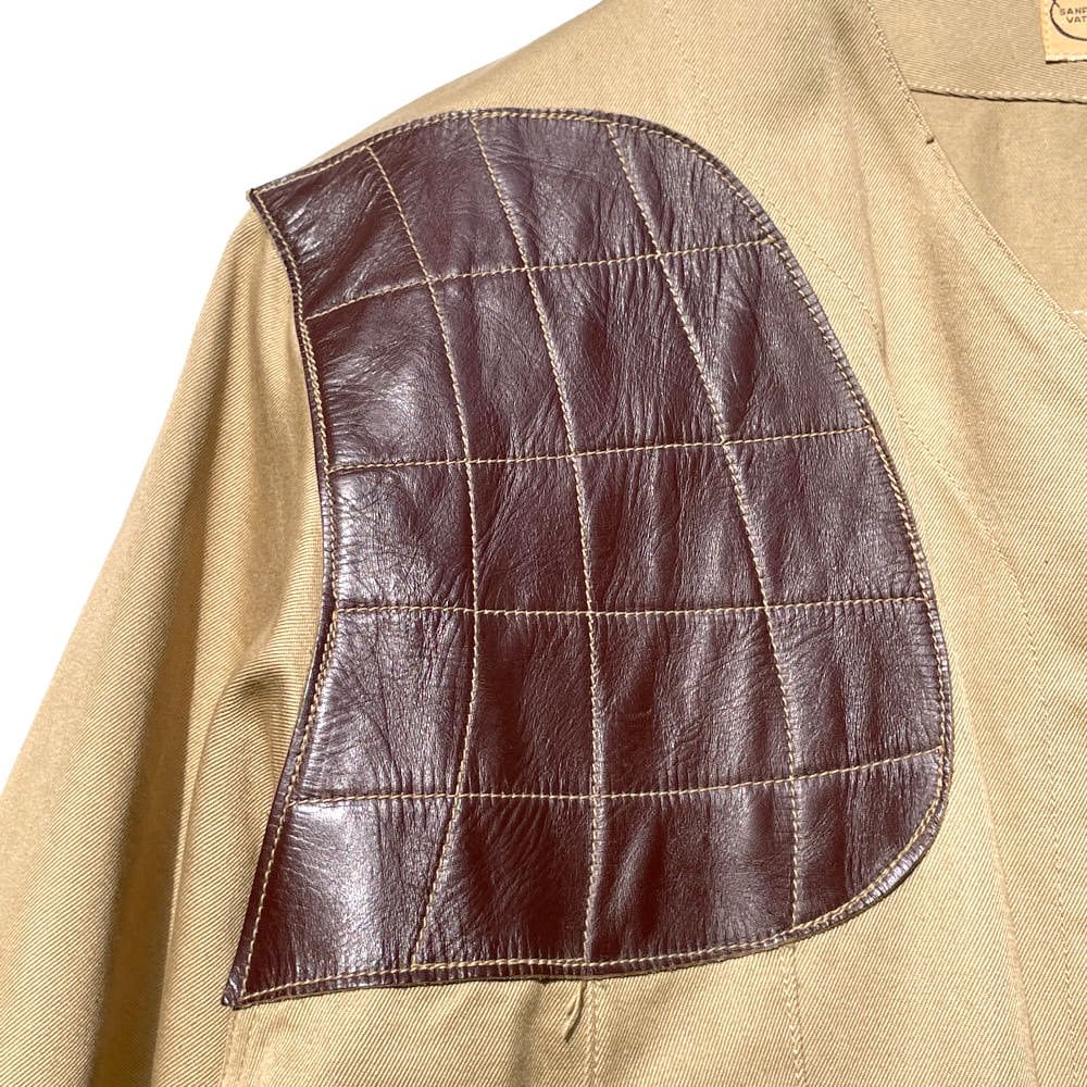The collarless neckline, leather pockets and gun patches contrast with the beige body for an antique look.