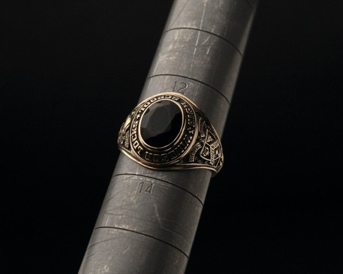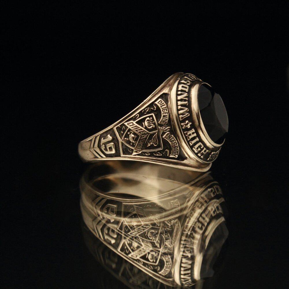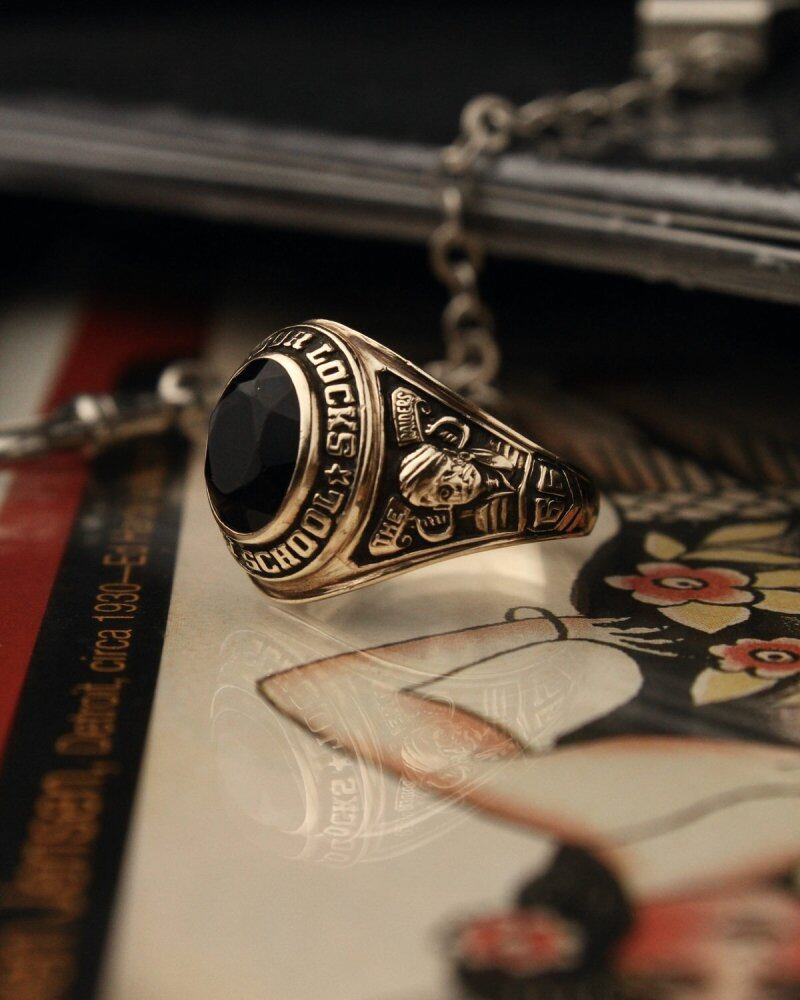 Vintage class ring from 1966. An individual with a beautiful contrast with cut onyx on the round silhouette top that is medium but heavy. The motto (hard work, honesty, civil rights) and a pirate motif are engraved on the side, making it more like this item. Made by the long-established BALFOUR company, stamped with 10kt gold. Please check the condition in the photo and understand the characteristics of vintage before purchasing.