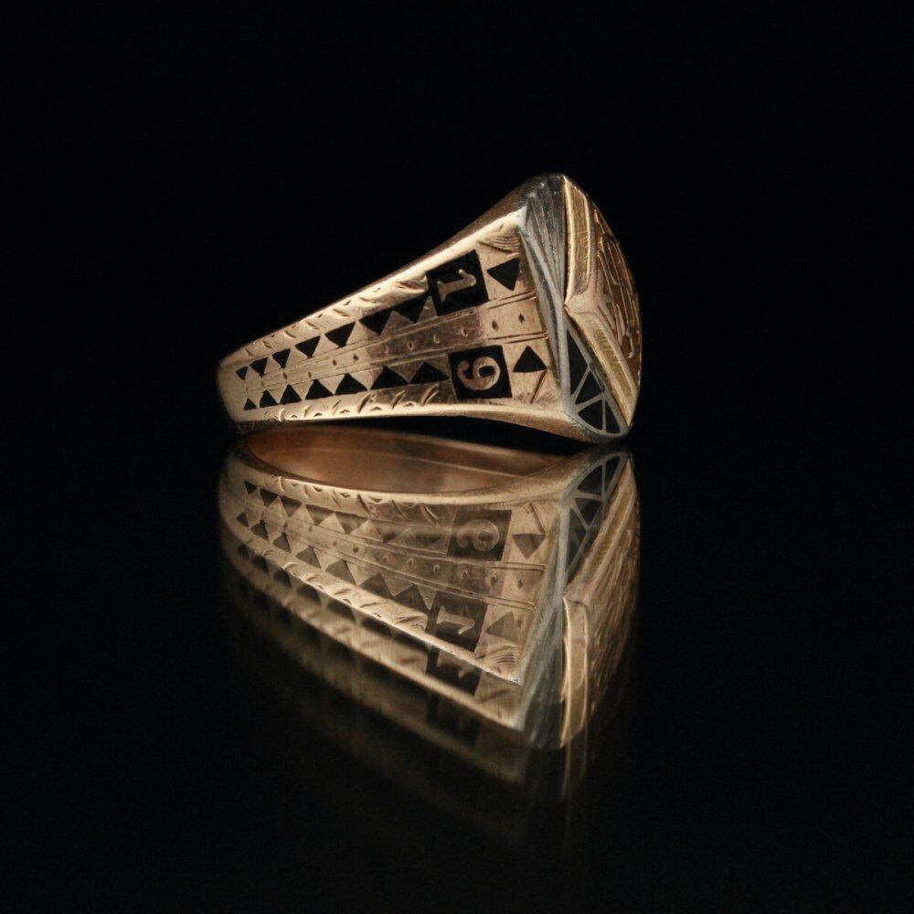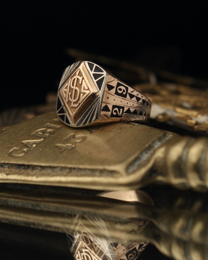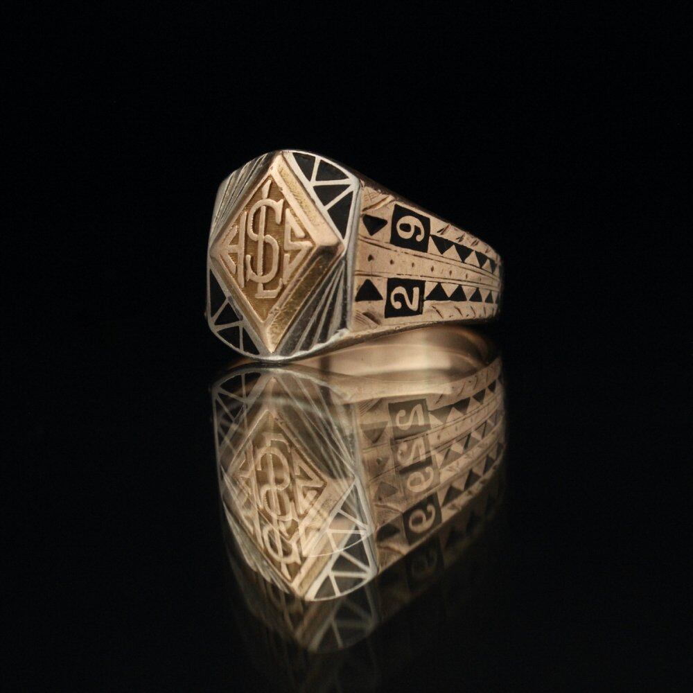Vintage class ring from 1929. Its almost antique, so its completely different from the later generation. The Great Depression that began in this era continued until the end of the 1930s, and jewelry from this era was mostly made of silver and brass, and gold was used, which is rare and characterized by its original design. This is a very rare gem with a design that makes you feel Art Deco as a whole. The 3-tone color of rose gold that gives a slightly reddish look and the white gold x yellow gold used on the top gives it an antique feel, while the black enamel gives it a minimalist atmosphere. Early Herff Jones company (established in the 1920s) stamped with 10 carat gold. Please check the condition in the photo and understand the characteristics of vintage before purchasing.