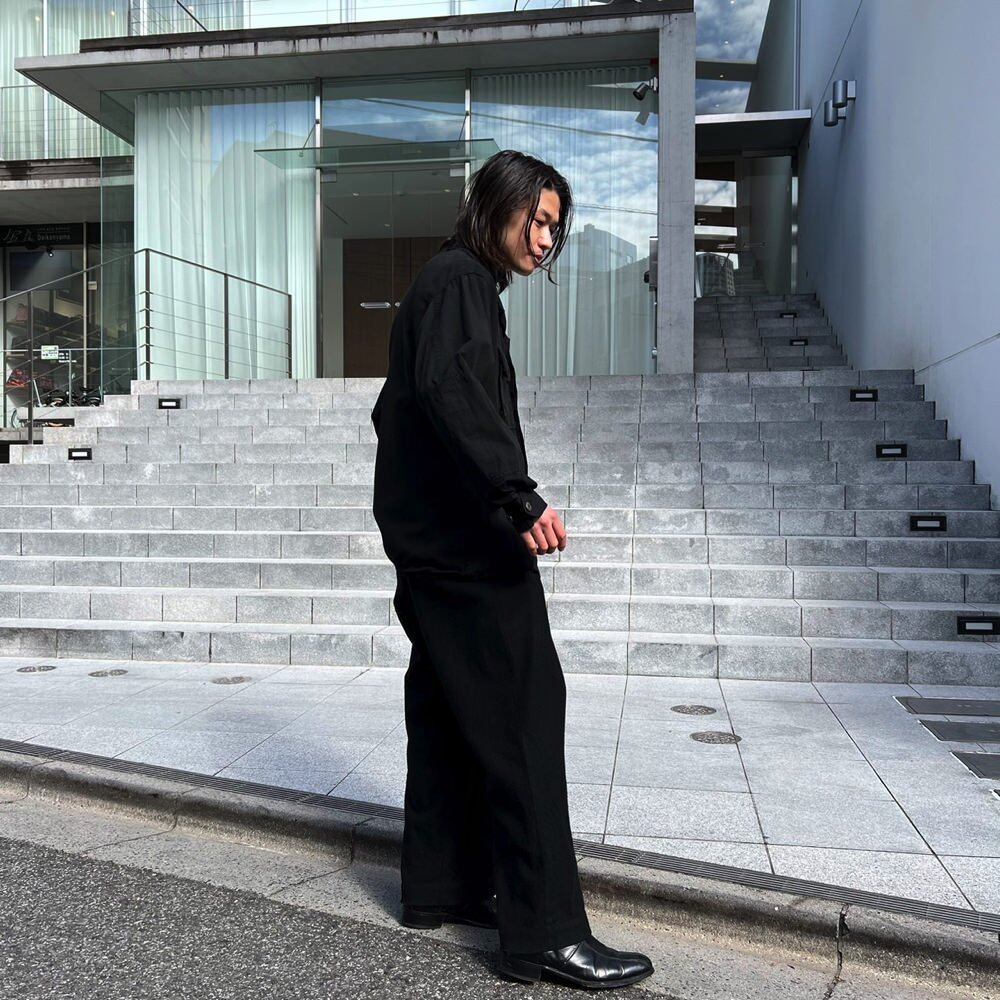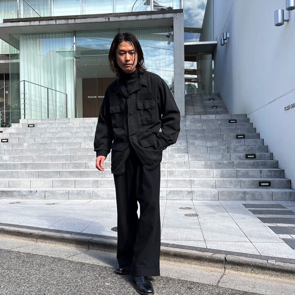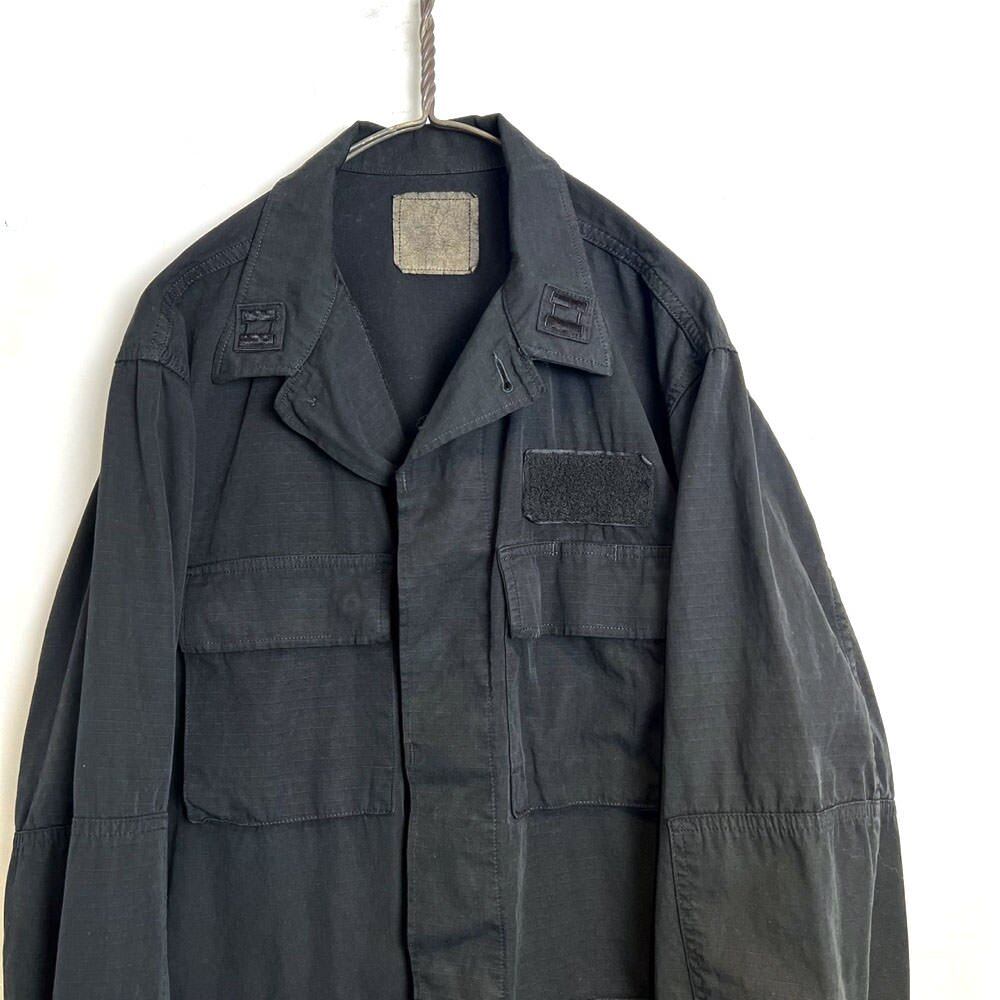 1990s American military fatigue jacket that has undergone piece dyeing. Made of cotton and nylon ripstop fabric that has become softer over time. The pocket with gusset provides storage capacity. Relaxed size and well-balanced silhouette, all black color that is easy to use for coordination
