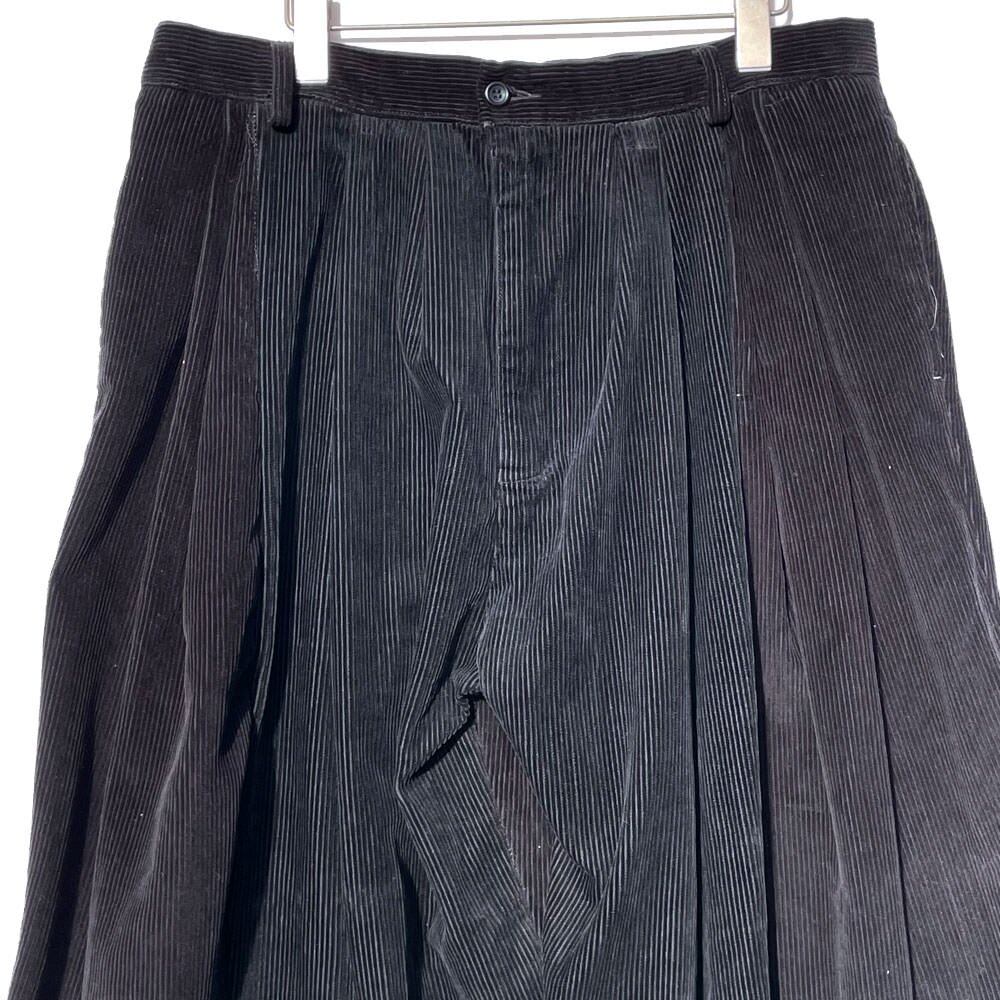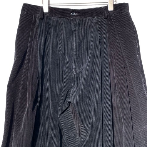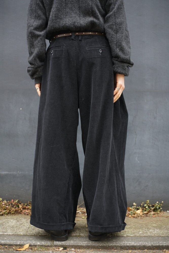 Wide pants from our original pimpstick remake line. Dismantling and reconstruction of casual trousers made of thick ribbed cotton corduroy fabric. By using two pieces, it has a wide silhouette that is not found in second-hand clothes, and the waist is deeply tucked to create a more voluminous feel and an elegant drape. The black contrast with different tones creates a unique presence. The 100% cotton has a light and supple texture that gives it a natural feel. A voluminous super wide silhouette. Quality: 100% Cotton Color: Black [Size] W: 89cm (35,0inch) H: FREE Rise: 33,5cm Watari: 55cm Inseam: 70cm Hem width: 37cm [Model size] Height: 175cm Shoulder width: 43cm B (Chest measurement ): 85cm W (Waist): 71cm