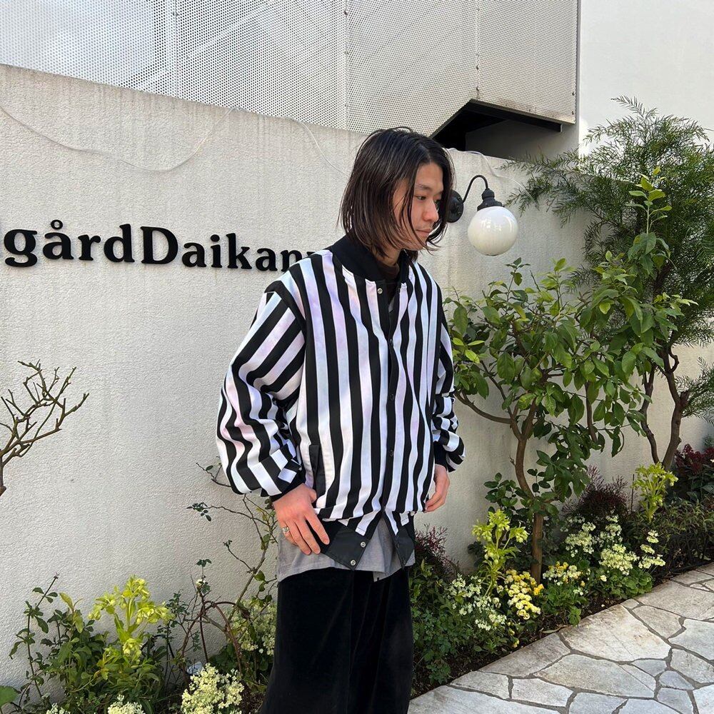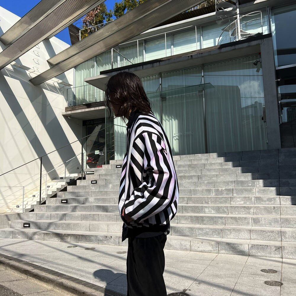 A hand-dyed referee jacket from the 80s with white and black monotone stripes and pale pink and blue for spring. A silhouette that can be worn regardless of body type with just the right amount of room