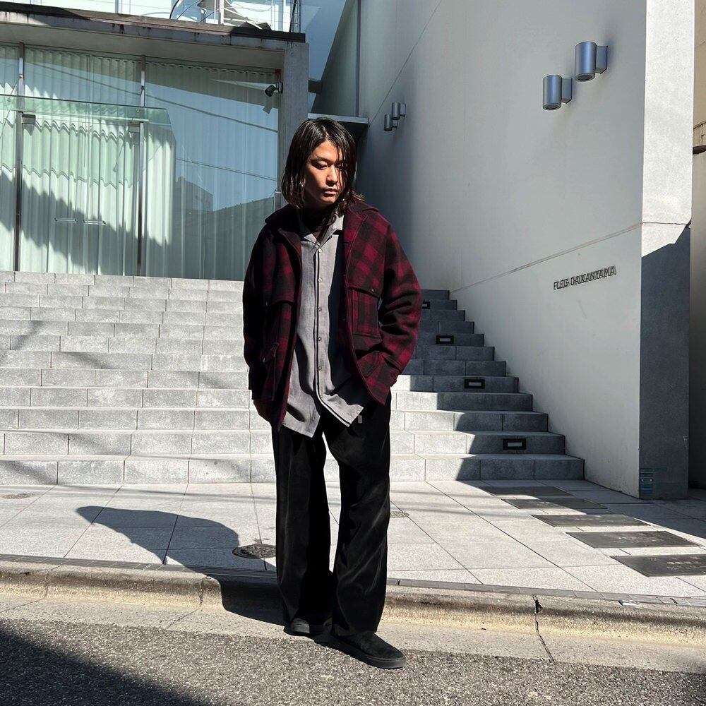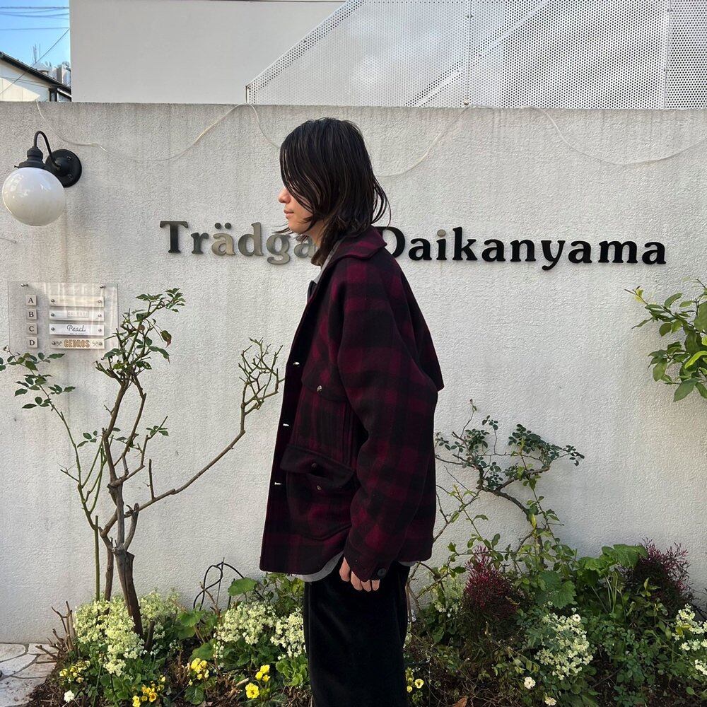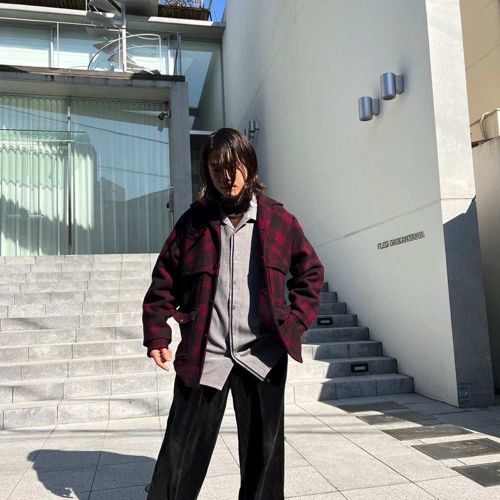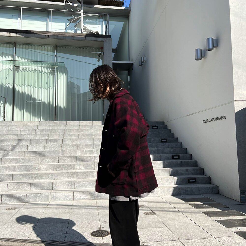 50s Hercules wool jacket Bordeaux x black dark shadow check is one piece with a good atmosphere. A well-balanced silhouette with moderate space and a sense of size. One piece with feeling