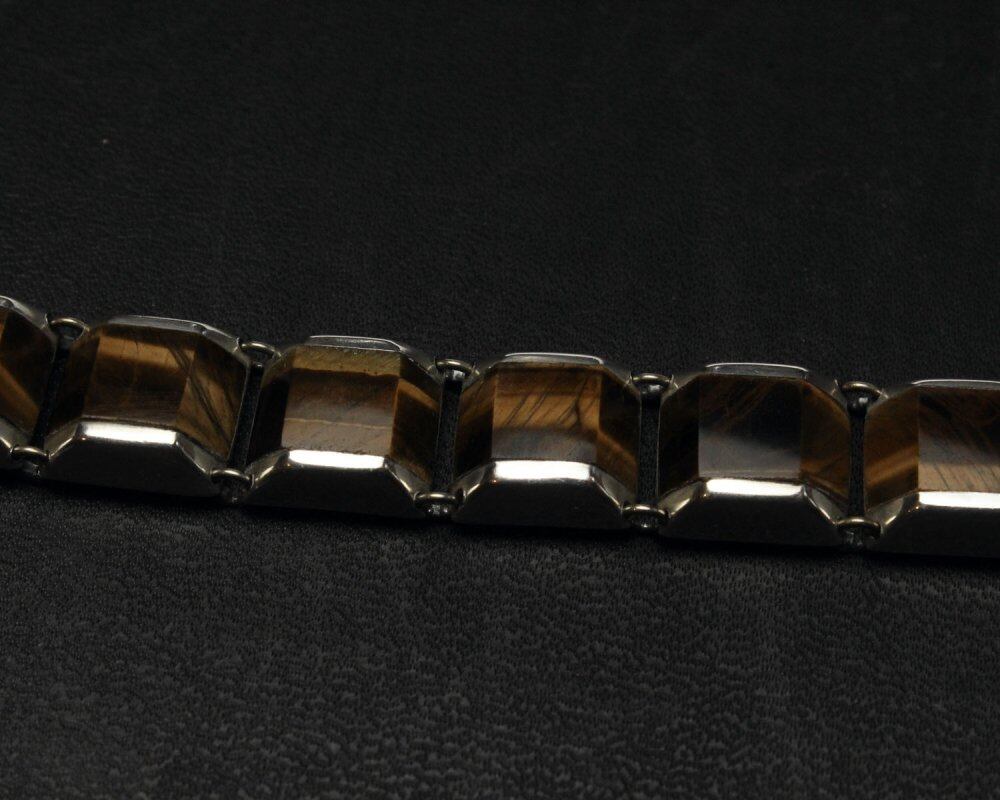 Made in Taxco, Mexico, one of the worlds leading silver mining areas, where many silver artists and craftsmen have gathered since ancient times. It is a vintage that has been attracting attention in recent years with its own evolution with a design like Native American jewelry that shows the influence of Southwestern America from the native Aztecs, and the sophisticated minimal design of Scandinavia. The design is like a beaded bracelet with gemstones embedded in a sterling body, and the pop and silver color gives it an elegant and casual presence. This is a solid three-dimensional square shape with a big tiger eye design. It has a mannish yet minimal and elegant appearance. 925 silver, stamped Mexico-Tasco. Since it is an old item, there are scratches, etc. Please check the photos and understand the characteristics of vintage before purchasing.
