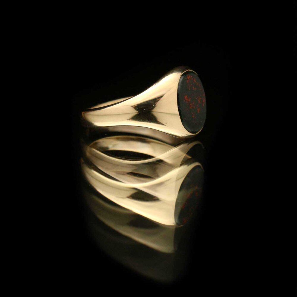 British signet ring. It is the only ring that is allowed to be worn by British gentlemen who wear good things that can be used for a long time without waste as much as possible. The bloodstone top is said to have turned into stone when the blood of Jesus Christ was crucified. It is said to bring spiritual energy from its holiness and is said to have a healing effect. A deep dark green with nice red spots and a dignified look. A very simple design with only a gold body and top that draws a soft curve. Although it is a rare pinky size, it is a gem that has a dignified yet casual look with a dignified and old individual structure. 375-9ct gold, hallmark of the 1961 Birmingham Assay Office. Please check the condition in the photo and understand the characteristics of vintage before purchasing.