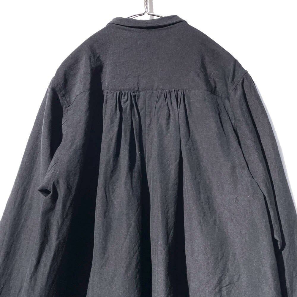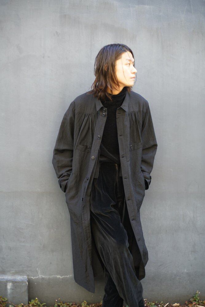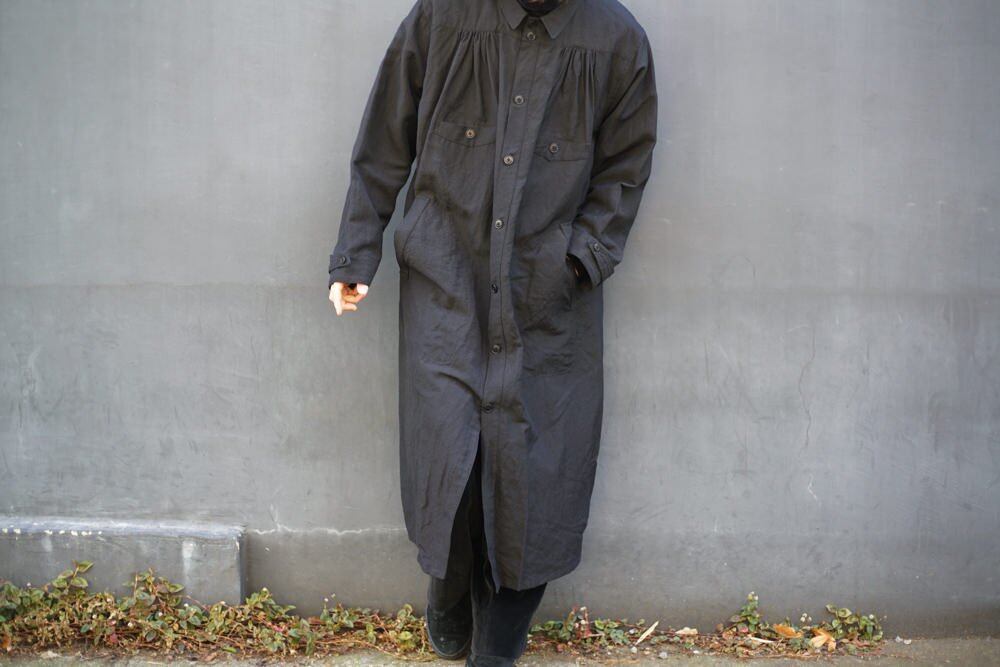 [ALVISTA] 5th issue Vol 1. 2023 S/S Called an open smock from the 1920s and 1930s, it is said to have been worn by French painters for work, and you can see images worn by painters at the time. Workwear motif. A one-panel design consisting of one piece of fabric on the left and right without removing the seams on the sides. Compared to regular coats, the amount of fabric used is generous, and the shape is created by narrowing it down with gathers, so the fabric spreads and shows movement in response to the wearers movements. The cuffs do not have a prominent design, and the tabs and buttons are used to incorporate unique specifications that allow for several types of squeezing, allowing the width of the cuffs to be adjusted to your liking. One wash finish.