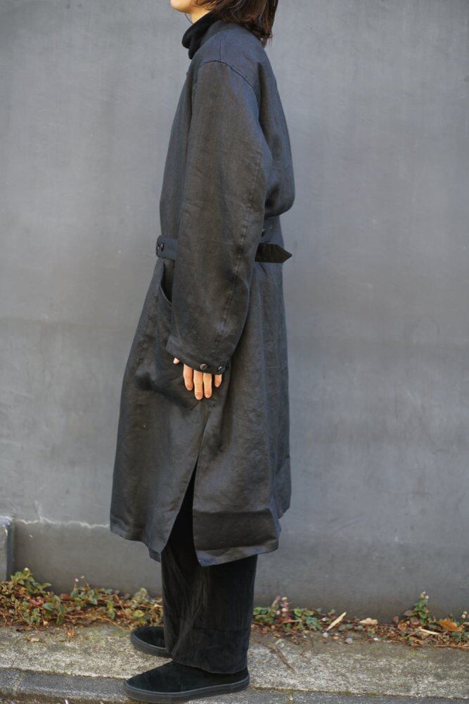 [ALVISTA] 5th issue Vol 1. 2023 S/S Mainly the late iconic style of the gown-type wrap dress that American painter Georgia OKeeffe liked and the Mexican silver artist Hector Aguilars belt. , a long shirt created in the image of her wardrobe. Inspired by the flowing shape of a shawl collar, the upper collar is inserted in an upright position, and the front meeting is diagonally deep to create a modified tailored collar. A belt made of both buttons and loops that combines decorativeness and practicality. The cracking shell button with a unique cut is used for the body, and the antique glass button from the Czech Republic is used for the belt. Because it uses a soft and drapeable fabric, it gives a completely different look when worn lightly and when worn with a belt tightened at the waist.