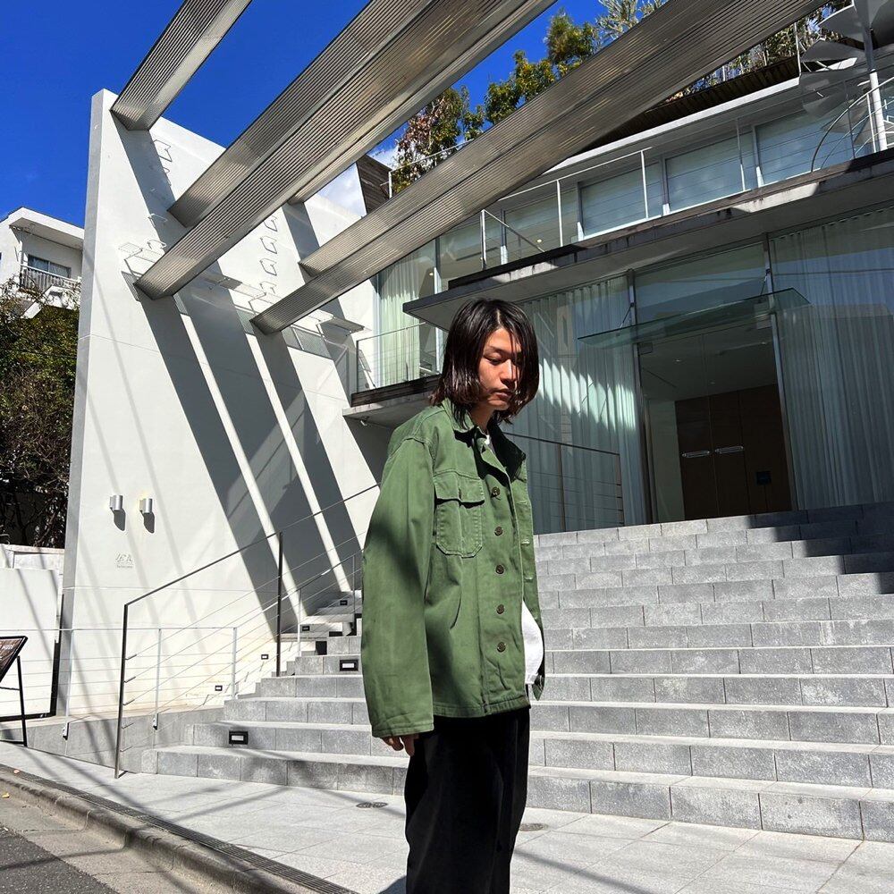 1950s U.S. Marine Utility Shirt The relaxed boxy silhouette gives it a masculine image. The stencil on the chest and the rubbed fabric have a nice texture. Just put it on over a T-shirt. one that looks like