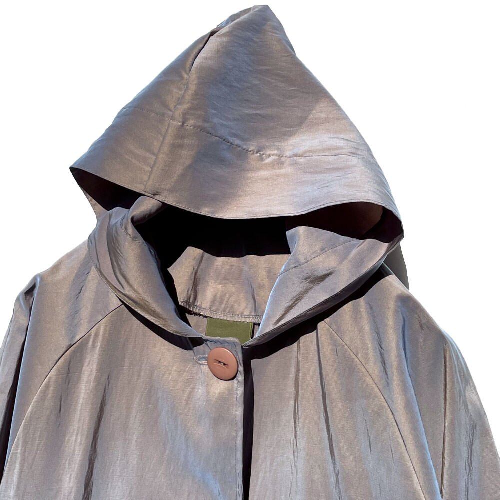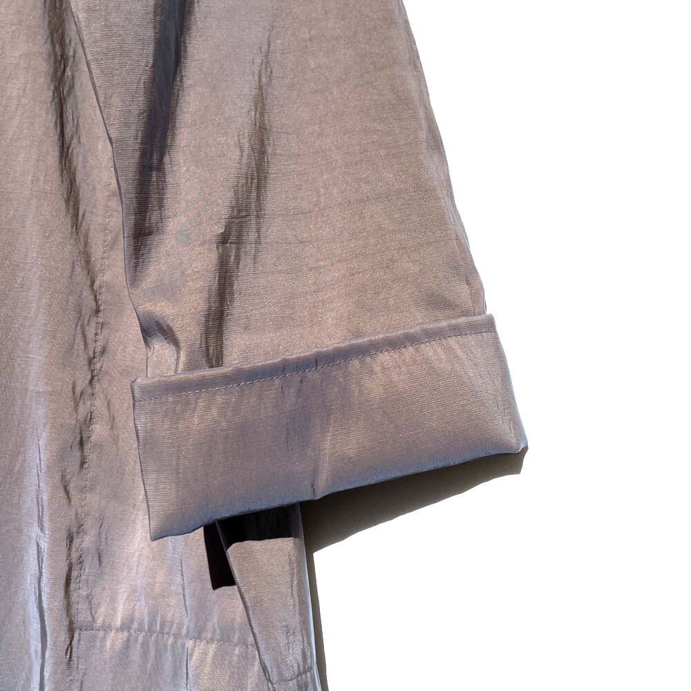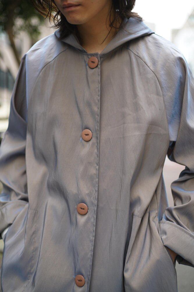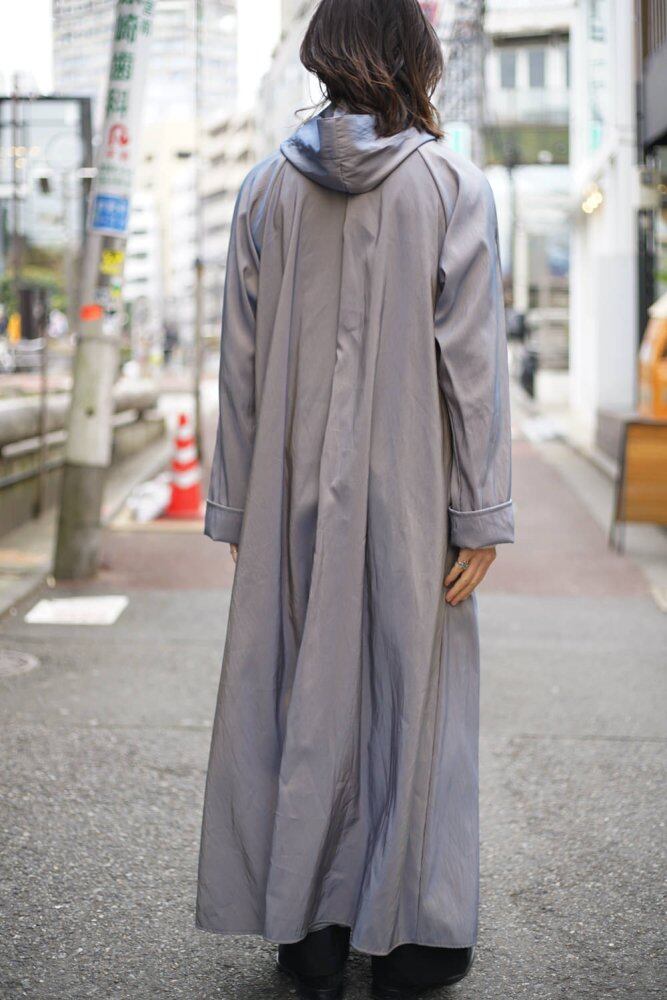 Around the 1980s, a vintage maxi nylon coat made by FERREE. Smooth and light nylon/polyester fabric is used, and blue threads are inserted into the weft, giving it an iridescent coloring that changes depending on the amount of light.