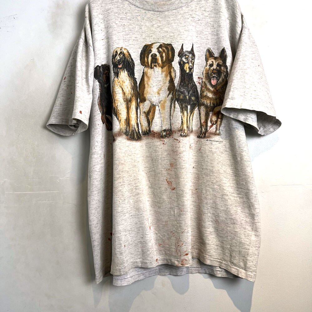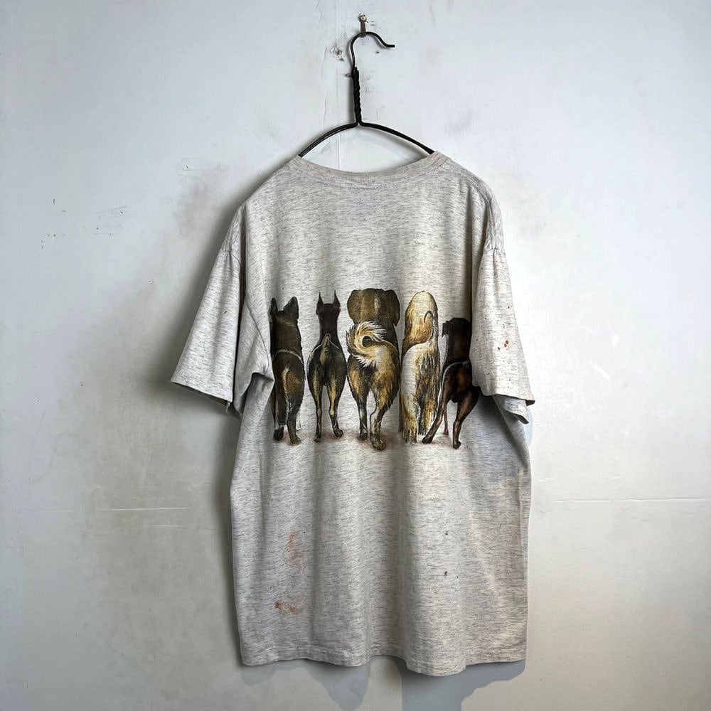 90s vintage T-shirt Soft and soft 100% cotton marbled gray body. Surrealistic dogs printed on both front and back. Paint stains here and there. vintage animal print t-shirt