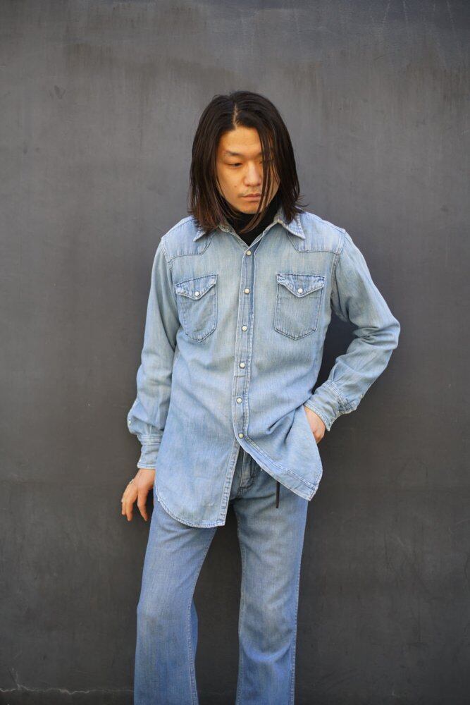 The ice bull coloring and aging that faded over time create a unique vintage presence, and the beautiful silhouette with the unique shape of a western shirt is impressive.