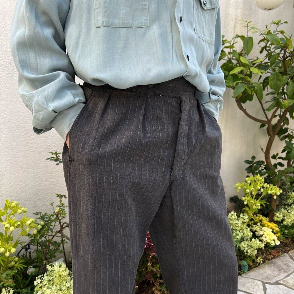 Wool gabardine trousers from the 30s gray and white x blue classic chalk stripe waist adjustment belt, etc. are also one that feels the history of the old age close to antique.