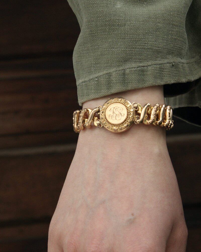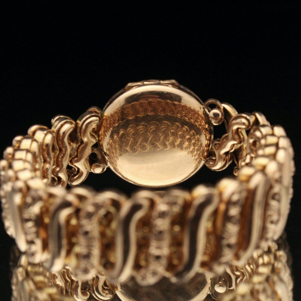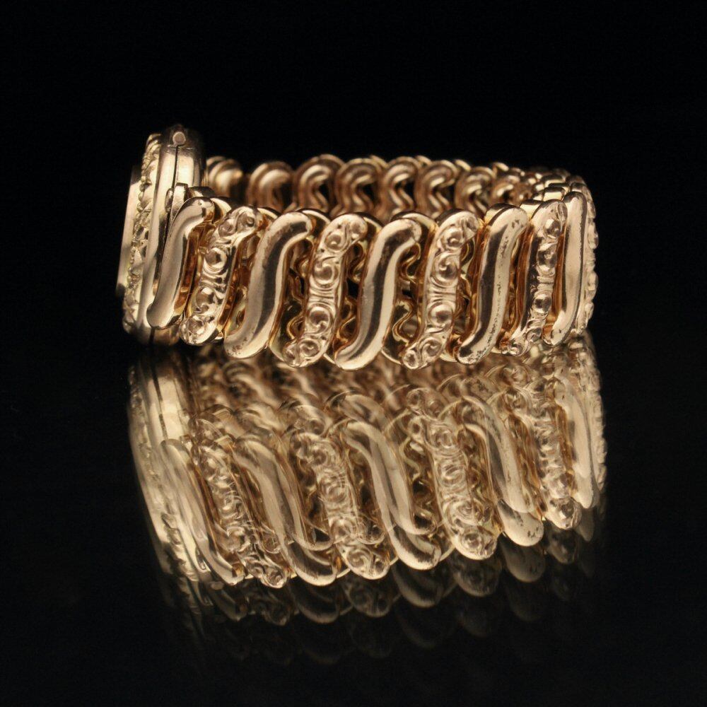 From the early 1900s to World War II, this item was given as a gift by couples during the war. The elastic bellows mechanism bracelet, which is not made today, has a moderate fit and is thickly gold-plated, and its gorgeous and delicate construction creates a vintage-like dignity and luxury atmosphere. I dont know the manufacturer, but this is an individual with a solid bellows mechanism, and it has an elegant look with antique workmanship and a mannish round top. A rare rocket top, more like this item - vintage-like specifications. There is no big impact on wearing, but one part is missing, and there is a part where the screws are loose and come off. Since it is old, there are dullness over time and fine scratches. Please check the photos and understand the characteristics of vintage before purchasing.