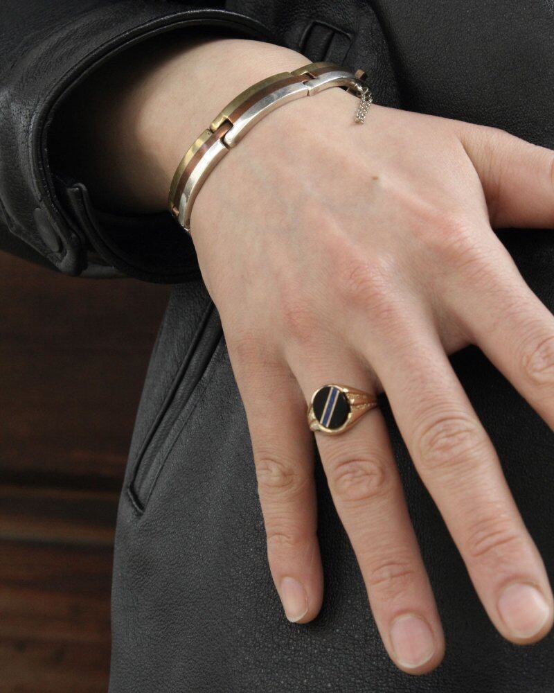British signet ring. It is the only ring that is allowed to be worn by British gentlemen who wear good things that can be used for a long time without waste as much as possible. The design with diagonal lines on the onyx top gives it a solid feel that is typical of this era. A blue azurite stone (looks like lapis lazuli) is placed in the center, making it a very rare and eye-catching individual. It is a ring with a minimal impression that is hard to find if you look for a good onyx condition. Stamped in 375-9ct gold, hallmarked by the 1990 Birmingham Assay Office. Please check the condition in the photo and understand the characteristics of vintage before purchasing.