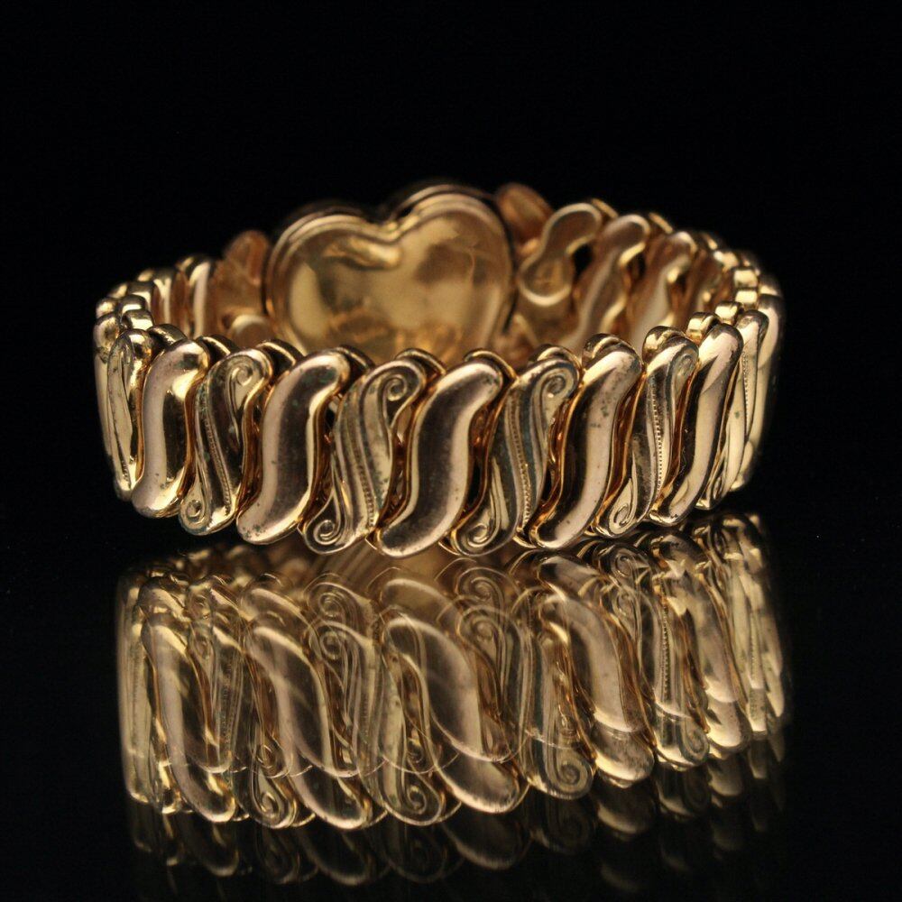 From the early 1900s to World War II, this item was given as a gift by couples during the war. The elastic bellows mechanism bracelet, which is not made today, has a moderate fit and is thickly gold-plated, and its gorgeous and delicate construction creates a vintage-like dignity and luxury atmosphere. Manufactured by Spiidel, a long-established company that started in the 19th century, the shell on the heart-shaped top gives it an elegant look, and it is a rare piece with a Masonic symbol, giving it a bewitching flavor. Since it is old, there are dullness over time and fine scratches. Please check the photos and understand the characteristics of vintage before purchasing.