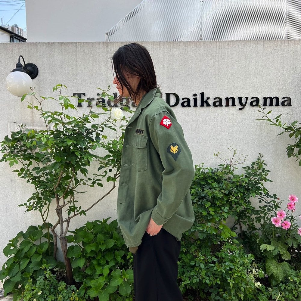 70s US Army utility shirt. The texture of the fabric has softened over time, and the olive color has faded moderately. The size is 16 half x 32.
