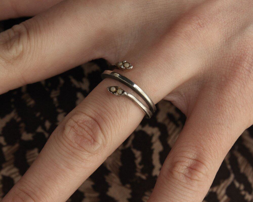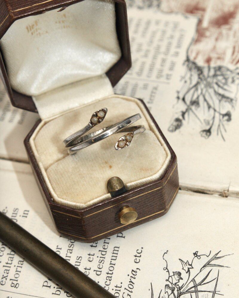 American long-established costume jewelry, ESPO ring. It is a design that has been used all over the world for a long time, meaning reincarnation and eternity, and is a motif that was popular mainly in the Victorian era of the 19th century. This is an individual with a simplified minimal design, pearl beads attached and an antique build, and an aged and gold-plated body that has been peeled off. The body is sterling silver or an alloy. Please check the condition in the photo and understand the characteristics of vintage before purchasing.