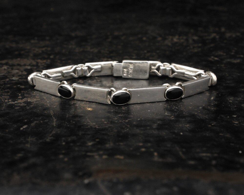 Made in Mexico, one of the worlds leading silver mining areas, where many silver artists and craftsmen have gathered since ancient times. It is a vintage that has been attracting attention in recent years with its own evolution with a design like Native American jewelry that shows the influence of Southwestern America from the native Aztecs, and the sophisticated minimal design of Scandinavia. This is a minimal appearance with narrow plates lined up, and a heavy and masculine flavor. Onyx is casually placed for a more contrasting and solid look. Since vintage silver jewelry is gaining popularity all over the world, especially heavy chain bracelets are in short supply in any vintage. MEXICO - Stamped in 925 silver. Since it is an old item, there are scratches, etc. Please check the photos and understand the characteristics of vintage before purchasing.