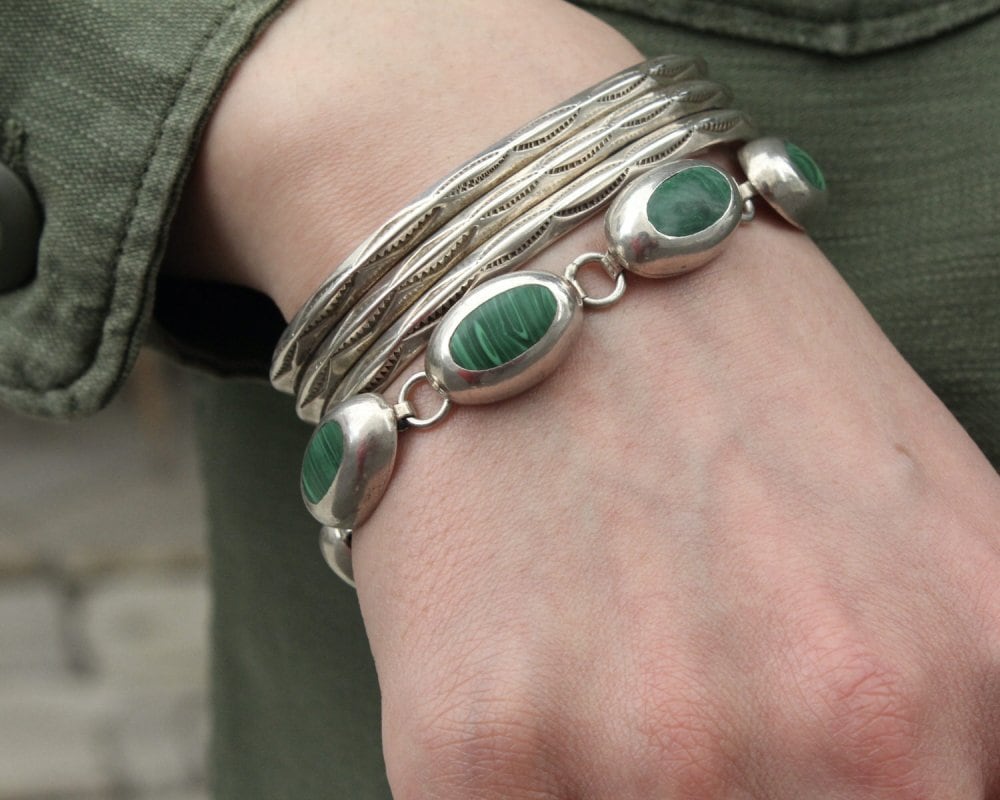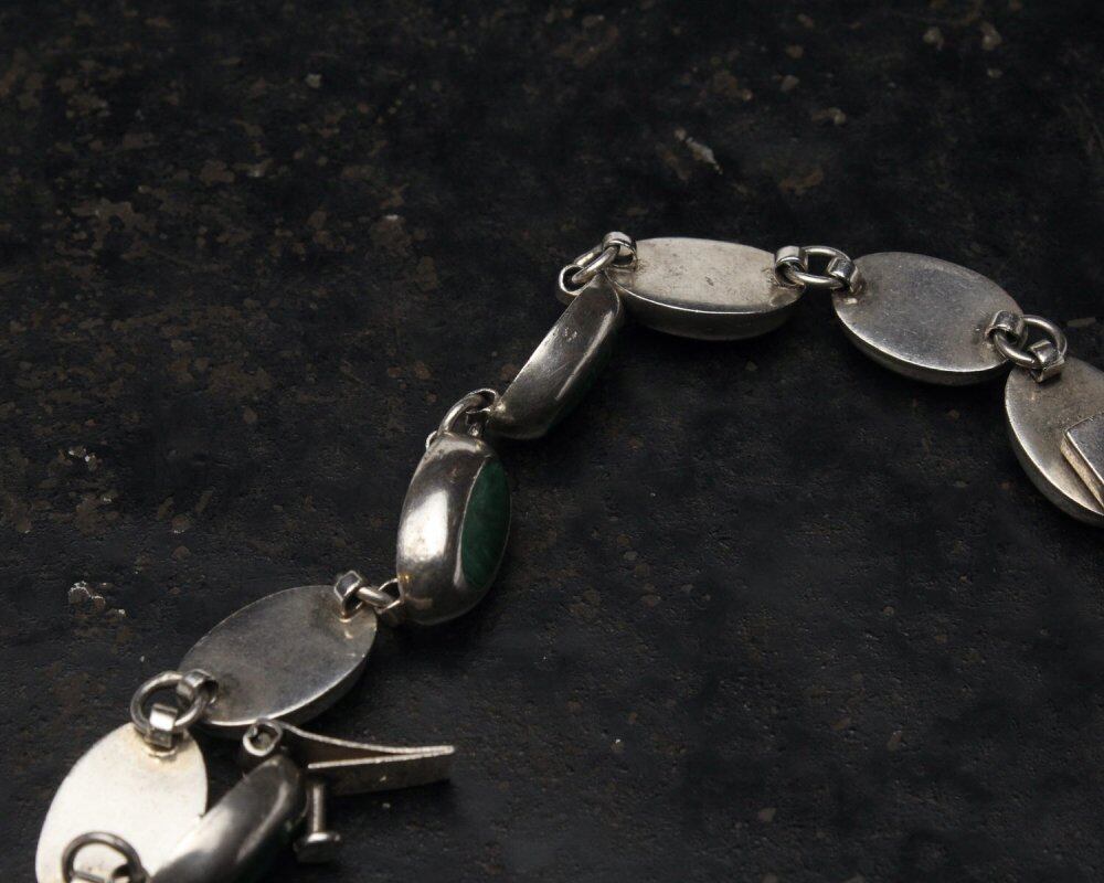 Made in Taxco, Mexico, one of the worlds leading silver mining areas, where many silver artists and craftsmen have gathered since ancient times. It is a vintage that has been attracting attention in recent years with its own evolution with a design like Native American jewelry that shows the influence of Southwestern America from the native Aztecs, and the sophisticated minimal design of Scandinavia. The design is like a beaded bracelet with gemstones embedded in a sterling body, and the pop and silver color gives it an elegant and casual presence. This is an oval shape with a profound feeling, and is made with an eye-catching yet elegant structure inlaid with green malachite native to Mexico. It has a solid appearance, but it is not too exaggerated and has a strong presence. 925 silver, stamped Mexico-Tasco. Since it is an old item, there are scratches, etc. Please check the photos and understand the characteristics of vintage before purchasing.