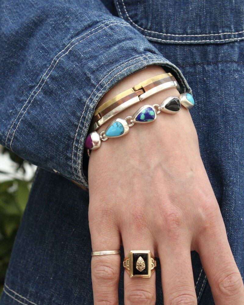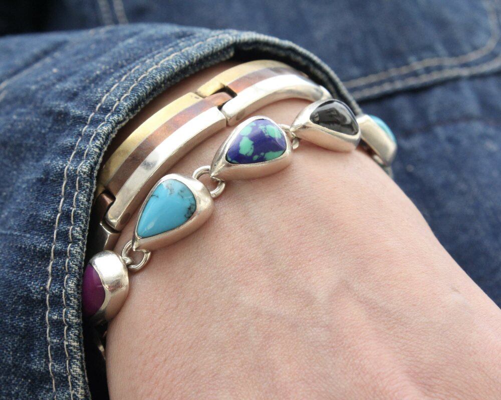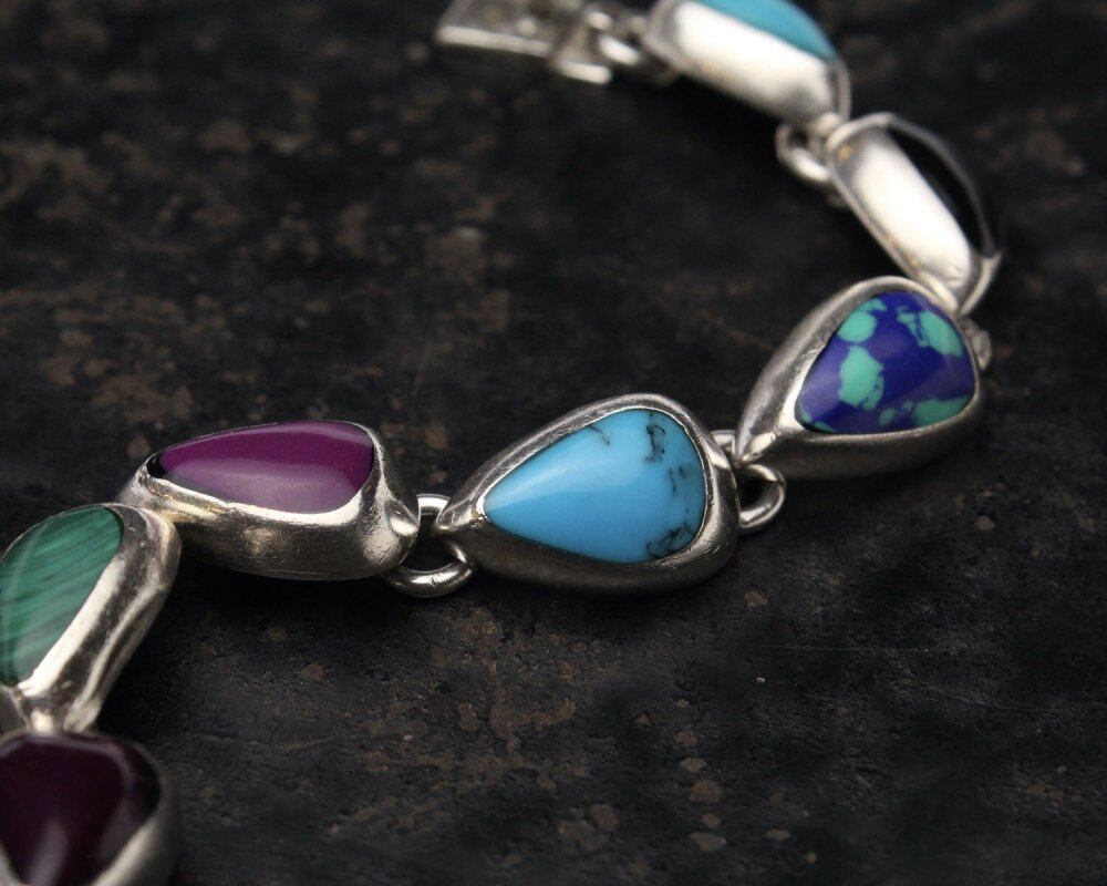 Made in Taxco, Mexico, one of the worlds leading silver mining areas, where many silver artists and craftsmen have gathered since ancient times. It is a vintage that has been attracting attention in recent years with its own evolution with a design like Native American jewelry that shows the influence of Southwestern America from the native Aztecs, and the sophisticated minimal design of Scandinavia. The design is like a beaded bracelet with gemstones embedded in a sterling body, and the pop and silver color gives it an elegant and casual presence. This is a teardrop shape with a heavy feeling, an unusual shape, and various ores are included to make it more eye-catching. It has a dignified appearance that is not too exaggerated even though it is heavy. 925 silver, stamped Mexico-Tasco. Since it is an old item, there are scratches, etc. Please check the photos and understand the characteristics of vintage before purchasing.