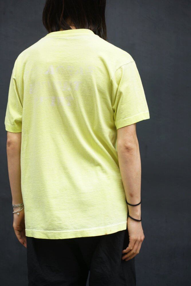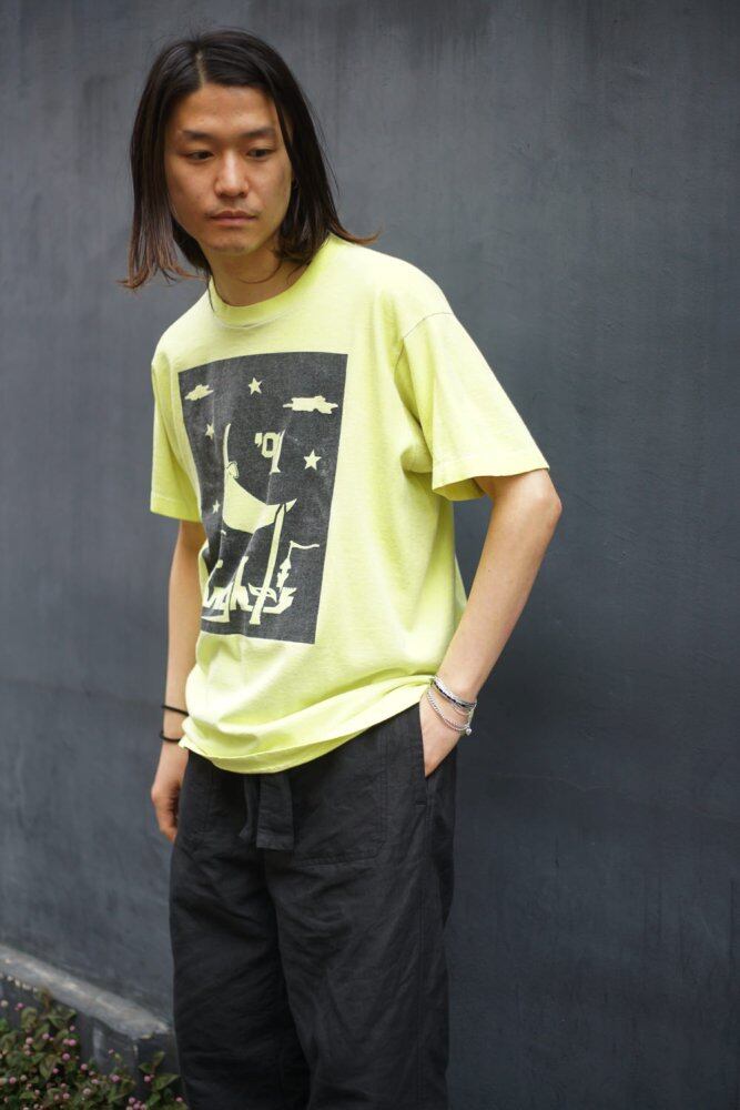 Around the 1990s, this is a vintage printed T-shirt. A piece-dyed pale yellow body with a comical moon artwork gives it a vintage-like retro mood.
