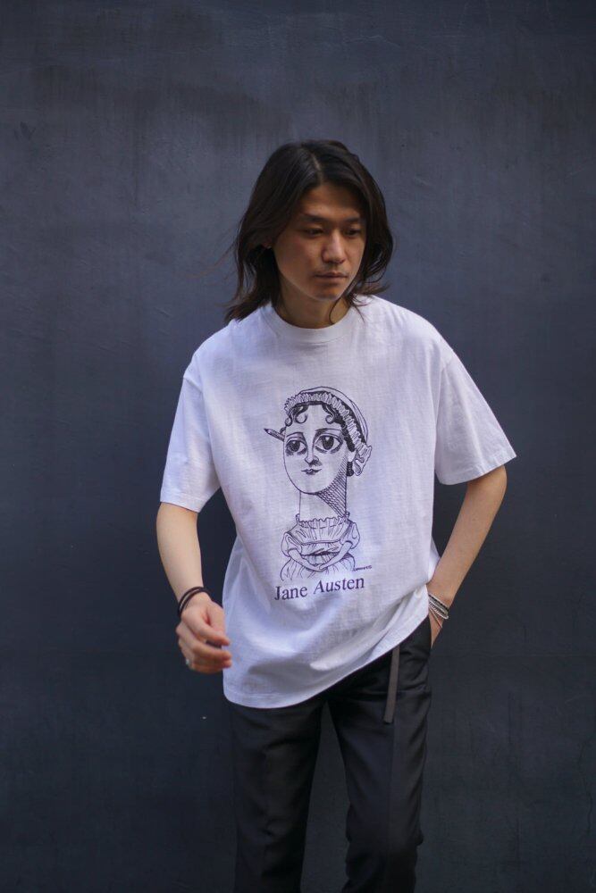 Caricature art print T-shirt made in 1991. Caricature is a technique of exaggerating and distorting portraits to emphasize the personality and characteristics of a person, and these series are targeted at celebrities and historical figures. A collectible piece.