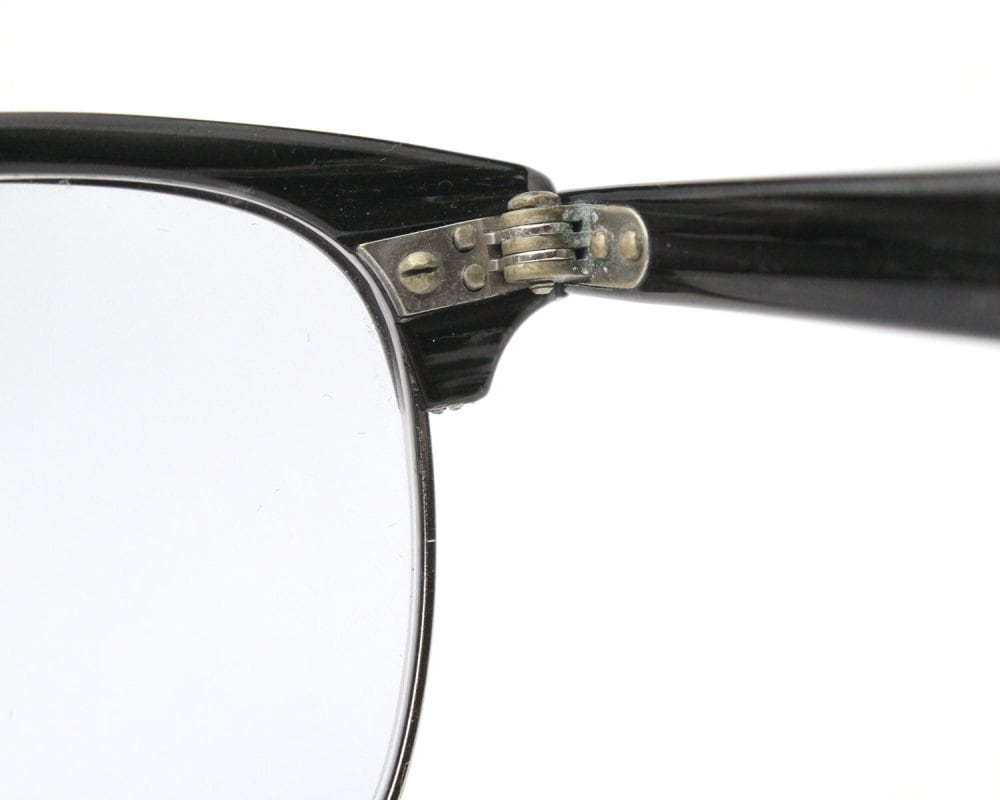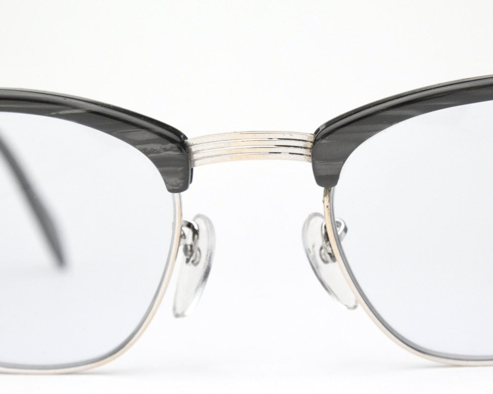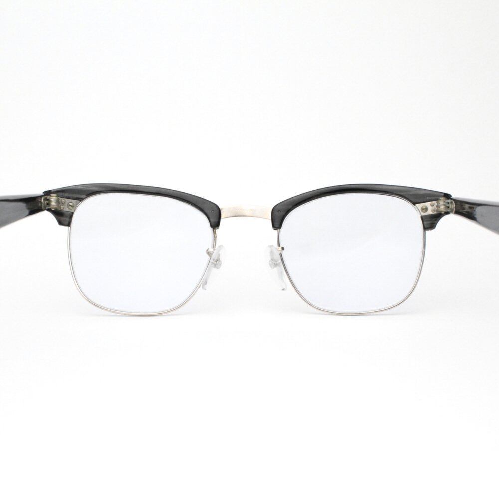 Vintage [American Optical] glasses from the late 1950s. Model Sir-Mont is a blow line design with a cell only on the upper part, which was an explosive hit by Ronsir developed by Shuron in 1947 and was planned by each manufacturer. It is said that the name Salmont was derived from the American military officer Mont who entrusted AO with the desire to show dignity due to his thin eyebrows. It is also famous for being worn by Malcolm X, who liked the birds feather-like hinge. This is a black and gray wood pattern, with a more solid expression and dignified appearance. Rare large size, clean silhouette. A new light grayish blue UV lens has been added. It has been appraised and maintained by an optician, and has been polished to give it a natural luster. The size of the temple (or rope) can be adjusted according to the degree of curvature. (At a nearby eyeglass shop) Although the condition has been carefully examined, there are scratches and scuffs as this is a vintage product. Please purchase after understanding the characteristics of vintage and antique. All of our eyeglasses are maintained and lens exchanged at g room, an eyewear store in Ebisu, Tokyo.