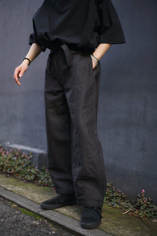 [ALVISTA] 5th issue Vol 1. 2023SS These pants are based on the motorcycle pants of the French army around the 1940s, which are generally called the early model. While keeping in mind the original form, the waist and hips are adjusted with tucks and darts, and the pattern is created with an image that makes the whole look neat. Straight and gentle tapered from around the hips with a lot of volume. A unique silhouette balance that makes the knee area look slightly bulging by putting darts in the hem. All the metal parts found in the original motorcycle pants have been removed to remove the ruggedness, and the width of the waist belt has been widened so that it can be worn either in the front or back. With double knee specifications on the front and double pockets, these pants are suitable for atelier work where you have to kneel on your knees or stand or bend down frequently. One wash finish.