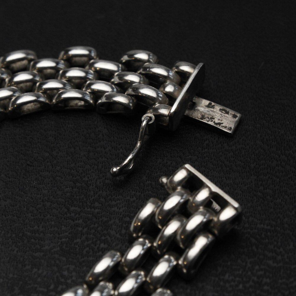 A chain bracelet made in Italy with craftsmen who specialize in delicate construction. The wide silhouette is reminiscent of the band chains of vintage watches. It is an individual that shows a minimal and rare profound feeling, and has an appearance that combines elegance and mannishness. Made in Italy 925 stamped. Since it is an old item, there are scratches, etc. Please check the photos and understand the characteristics of vintage before purchasing.