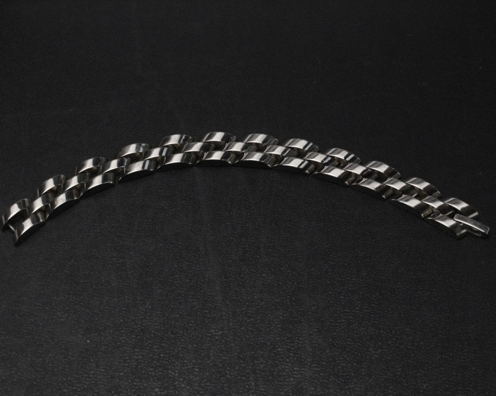 Made in Mexico, one of the worlds leading silver mining areas, where many silver artists and craftsmen have gathered since ancient times. It is a vintage that has been attracting attention in recent years with its own evolution with a design like Native American jewelry that shows the influence of Southwestern America from the native Aztecs, and the sophisticated minimal design of Scandinavia. This is a very heavy 63g individual, with a flat design and curved silhouette reminiscent of a vintage watch band chain, giving it a mannish and elegant look. Made of chrome-treated sterling silver used in the 1950s, it is matte and has an elegant construction that gives an engineering impression. Since vintage silver jewelry is gaining popularity all over the world, especially heavy chain bracelets are in short supply in any vintage. MEXICO - Stamped in 925 silver. Since it is an old item, there are scratches, etc. Please check the photos and understand the characteristics of vintage before purchasing.