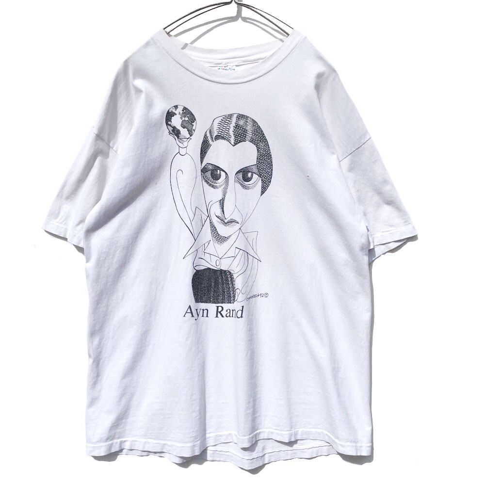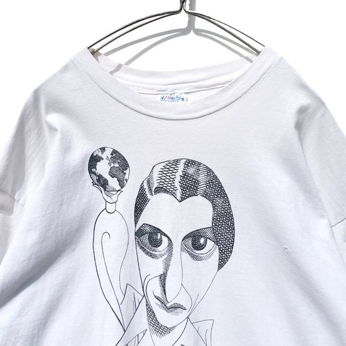 Caricature art print T-shirt made in 1992. Caricature is a technique of exaggerating and distorting portraits to emphasize the personality and characteristics of a person, and these series are targeted at celebrities and historical figures. A collectible piece.