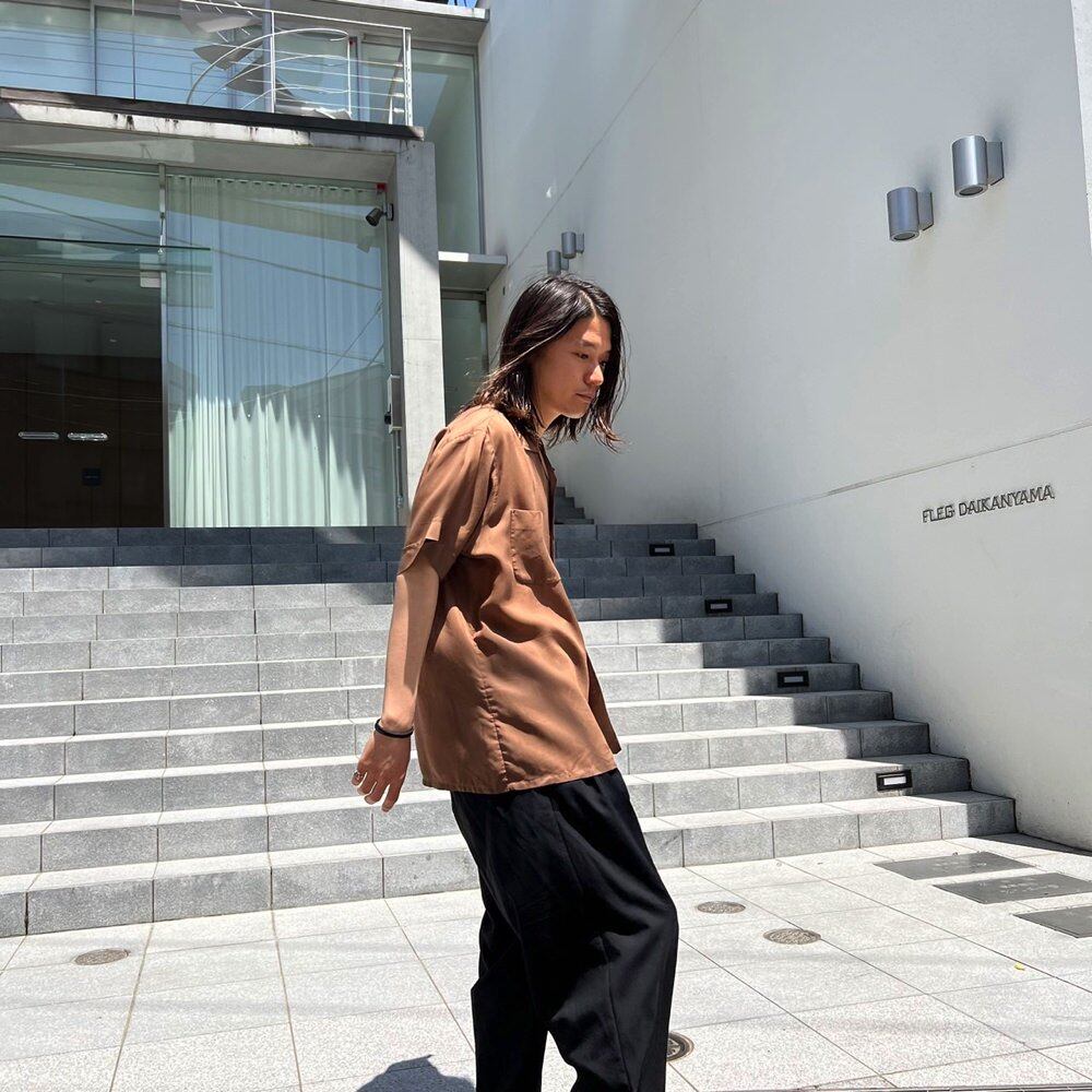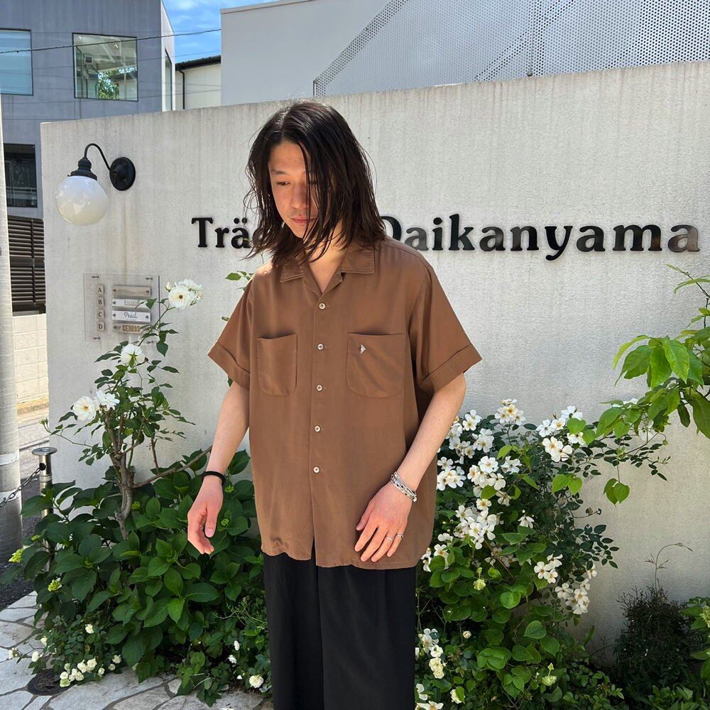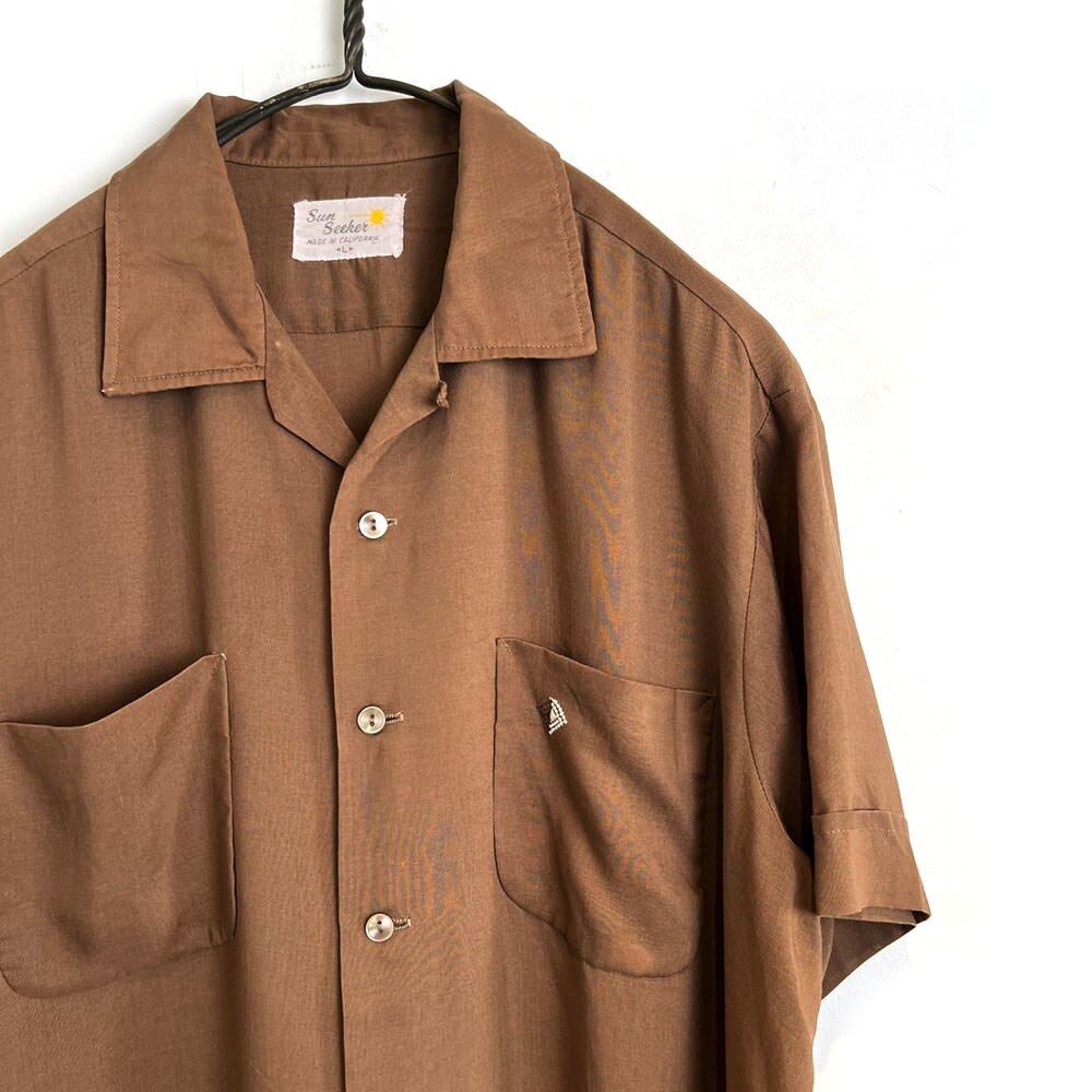 Short sleeve shirt from the 60s The grayish brown color gives it a classy and mature look. One-point embroidery in the breast pocket gives a sense of style. Light and smooth rayon x polyester fabric. , a vintage-like box silhouette