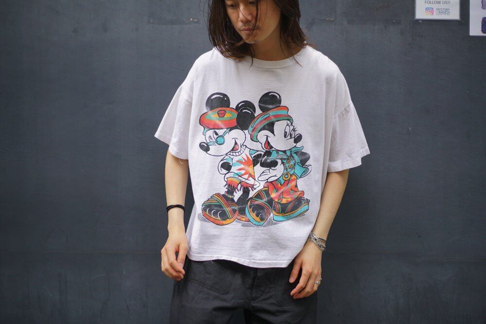 Around the 1980s, this is a vintage Mickey & Minnie print T-shirt.