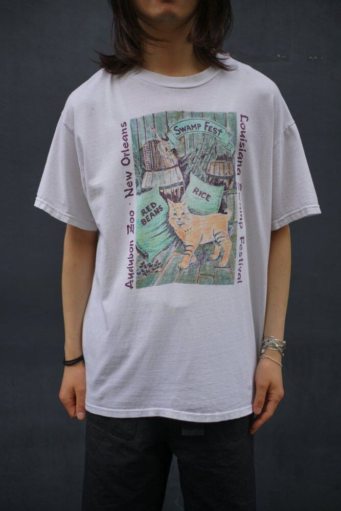 Audubon Zoo festival print t-shirt, circa 1990s.<BR> It seems to be a commemorative T-shirt when the Audubon Zoo in New Orleans participated in a festival in Louisiana, and the vintage retro touch with cats printed on a messy background like a swap meet enhances the atmosphere.