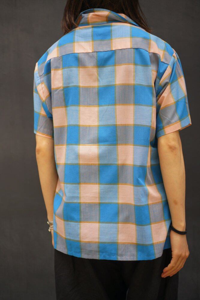A retro check pattern that shows a vintage-like dull blue and pink mannish look, and a 50s style box silhouette enhances the atmosphere with a classic look.