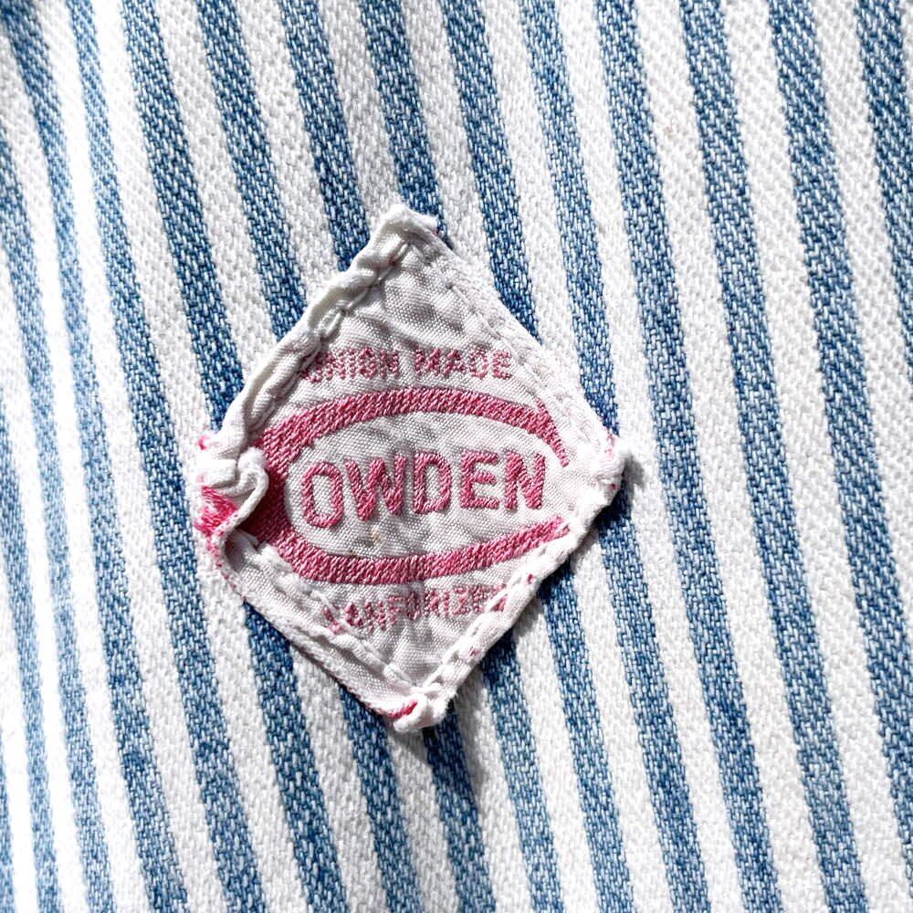 The fabric has softened over time and has a light texture, realistic stains on the hickory striped body, and a kind of artistic expression with repair marks, making it a special piece that gives off a unique presence.