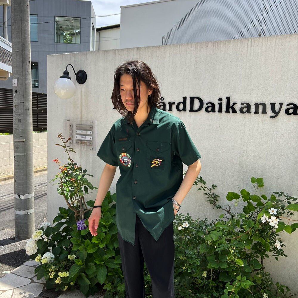 A short-sleeved boy scout shirt from the 60s. A dark green color that gives a sense of depth and a colorful patch.