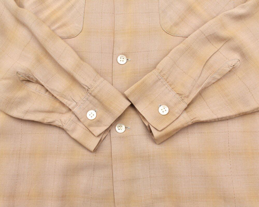 Open collar shirt from the 1960s. A shadow check pattern with rayon specifications that has been valuable in recent years. The slightly reddish beige and mustard-colored delicate shadow check give it an elegant and mannish look. The smooth rayon fabric has a thick and slightly crisp feel and a comfortable texture. Although it is M size, it has a moderately relaxed silhouette. The yoke lining fabric is damaged, and overall it is in good condition as a rare second-hand item. Since it is an old item, it rarely deteriorates over time. Please check the photos and understand the characteristics of vintage before purchasing.