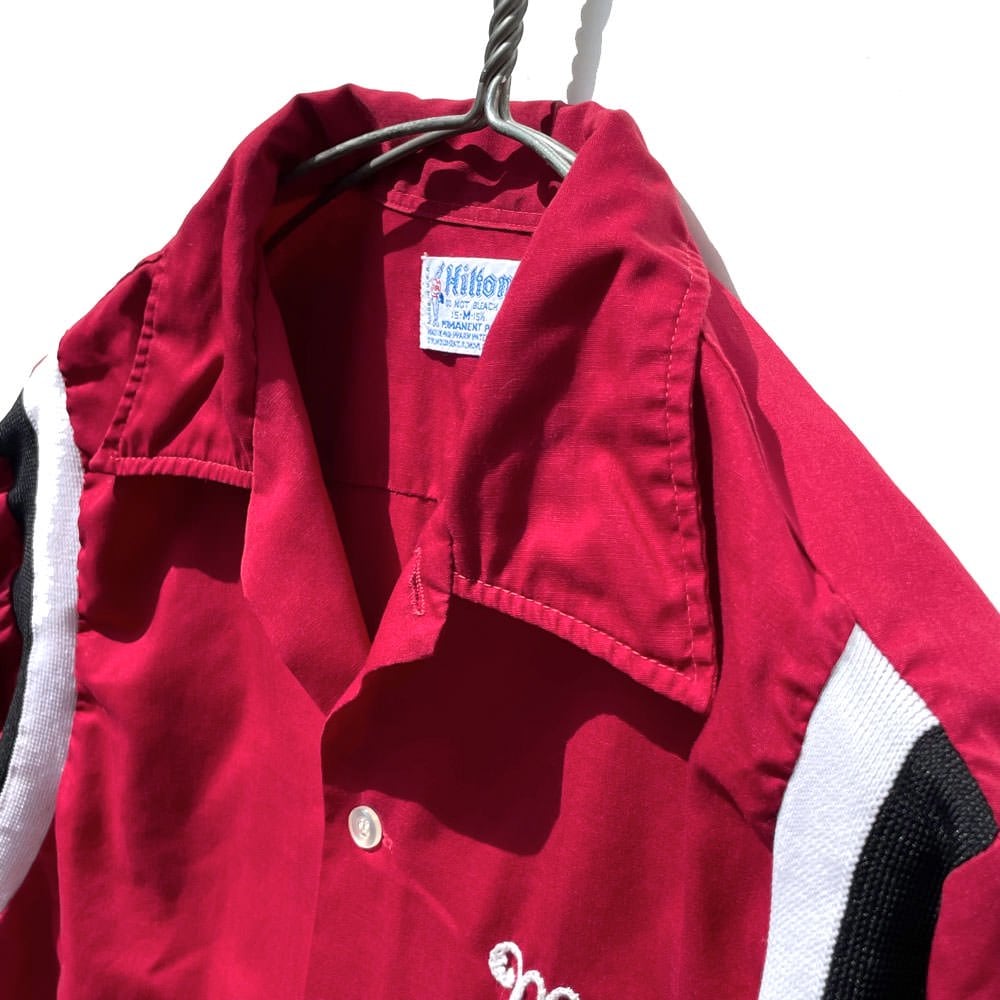 A vintage bowling shirt with a blue tag made by Hilton in the 1970s.